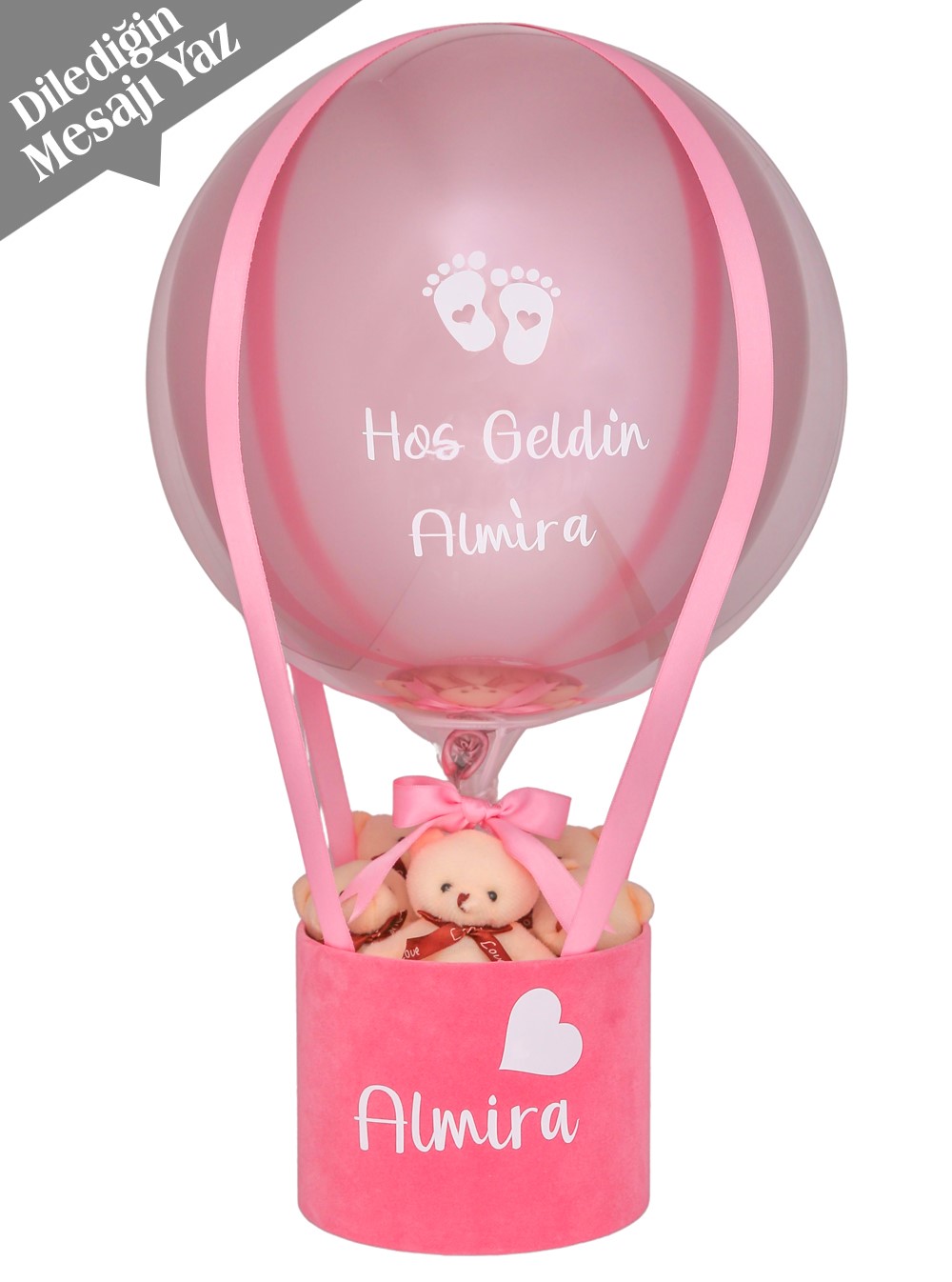 Sevginizi en tatlı şekilde ifade etmenin yolu olan Pembe Temalı Ayıcıklı Balon Kutusu, kız bebek tebriği için özenle hazırlandı. İçerisindeki sevimli peluş ayıcıklar ve pembe detaylarla süslenmiş şık kutu, üzerine yazılacak kişisel mesajlı balon ile daha da anlamlı hale geliyor.