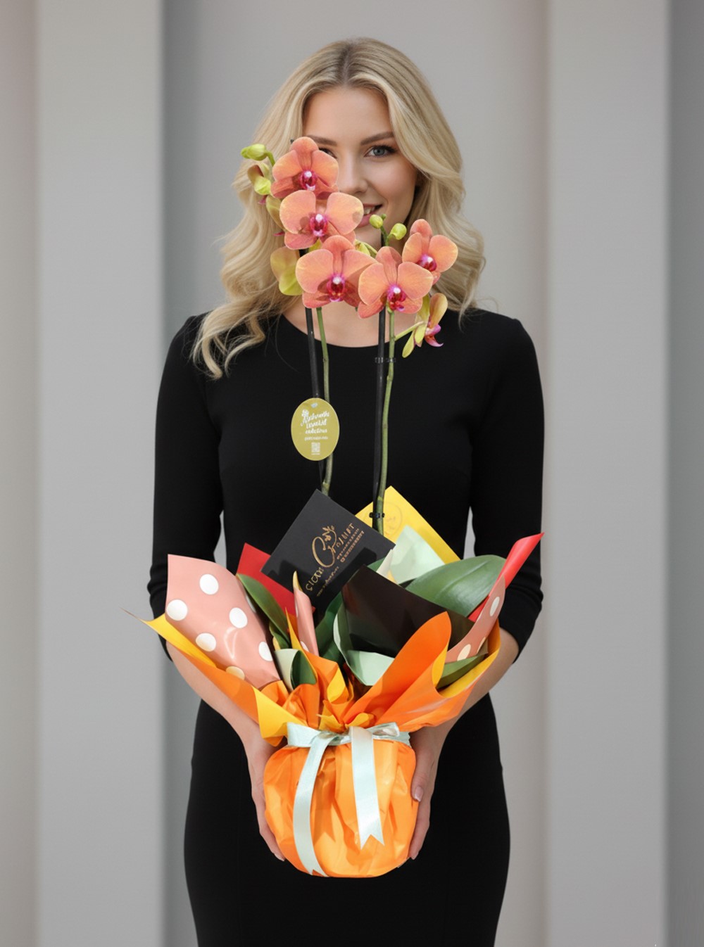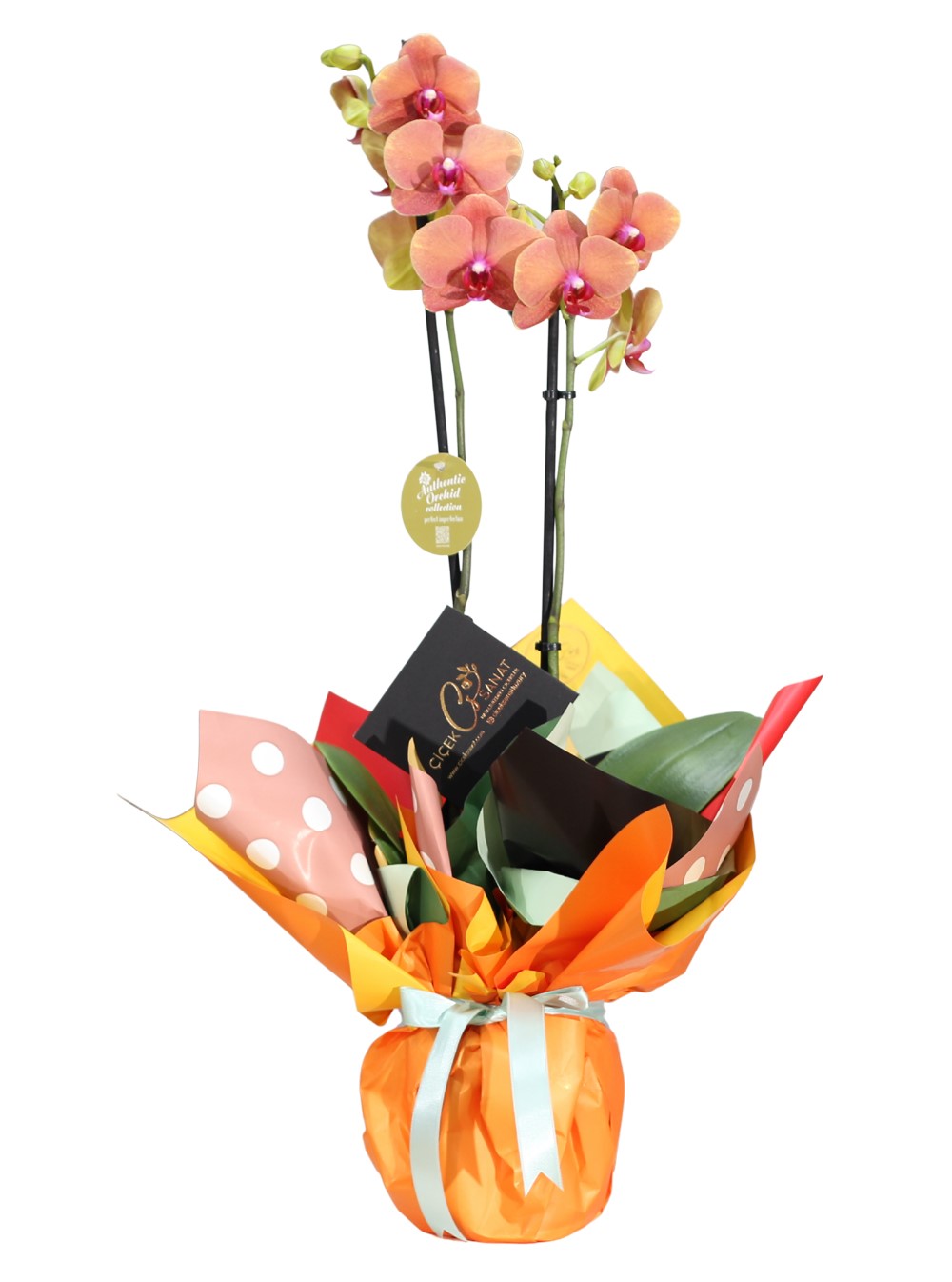 Eşsiz Ateş Rengi Orkide, klasik orkide zarafetini canlı ve sıcak tonlarla birleştirerek bulunduğu ortama anında enerji ve neşe katıyor. Şeftali ve mercan tonlarındaki çiçekleri, adeta ateşin sıcaklığını ve güneşin pozitif enerjisini yansıtır.