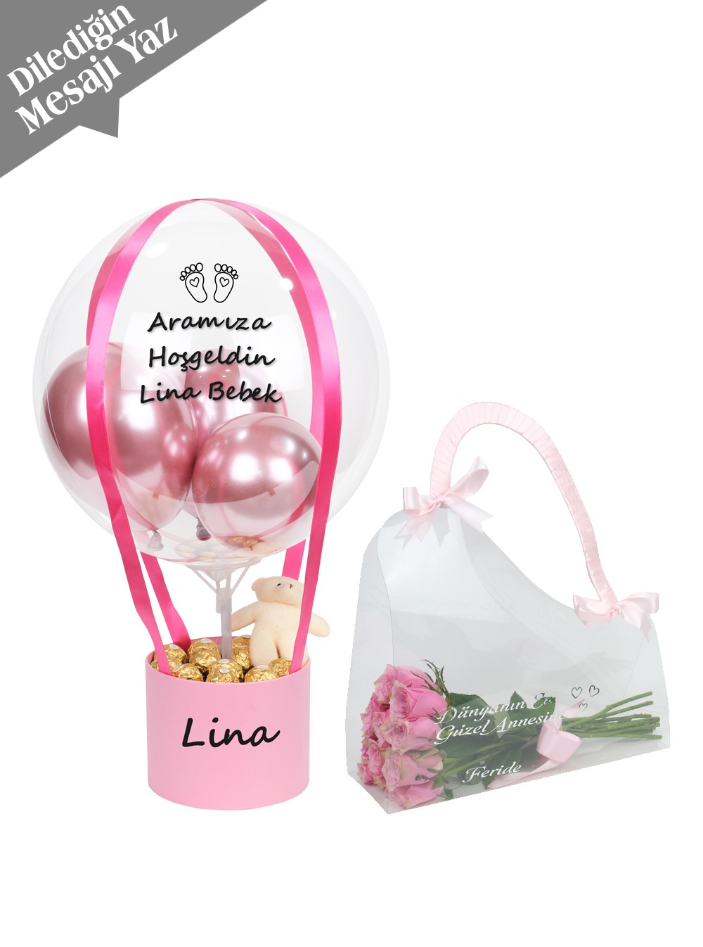 Bu şık balon kutusu, sevimli bir ayıcık ve enfes 10 adet Rocher çikolata ile birlikte gelen ve yanında çantada 8 adet pembe gül ile dolu. Hem anneye hem de bebeğe olan sevginizi ifade etmenin en güzel yolu! Pembe ithal güller ve kadife kutusu ile göz kamaştırırken, aynı zamanda gönül okşayan bir hediye deneyimi sunuyor.
