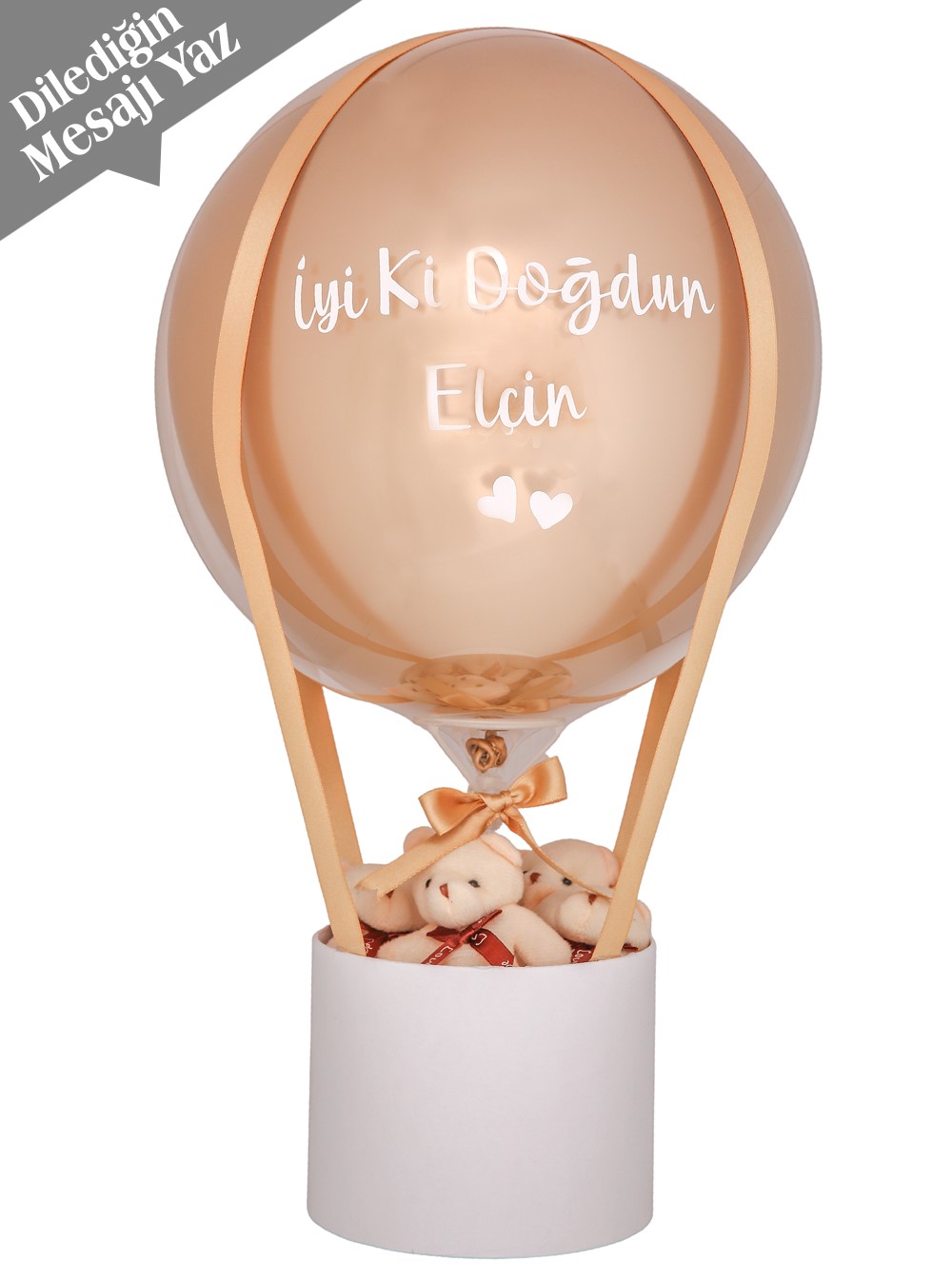 Sevimliliği ve zarafeti bir arada sunan GoldTemalı Ayıcıklı Balon Kutusu, özel günlerde mutluluk vermek için tasarlandı. İçerisindeki sevimli peluş ayıcıklar ve gold tonlarında süslemelerle hazırlanan bu şık kutu, aynı zamanda üzerine dilediğiniz mesajın yazılabileceği balon ile kişiye özel hale getirilebiliyor.