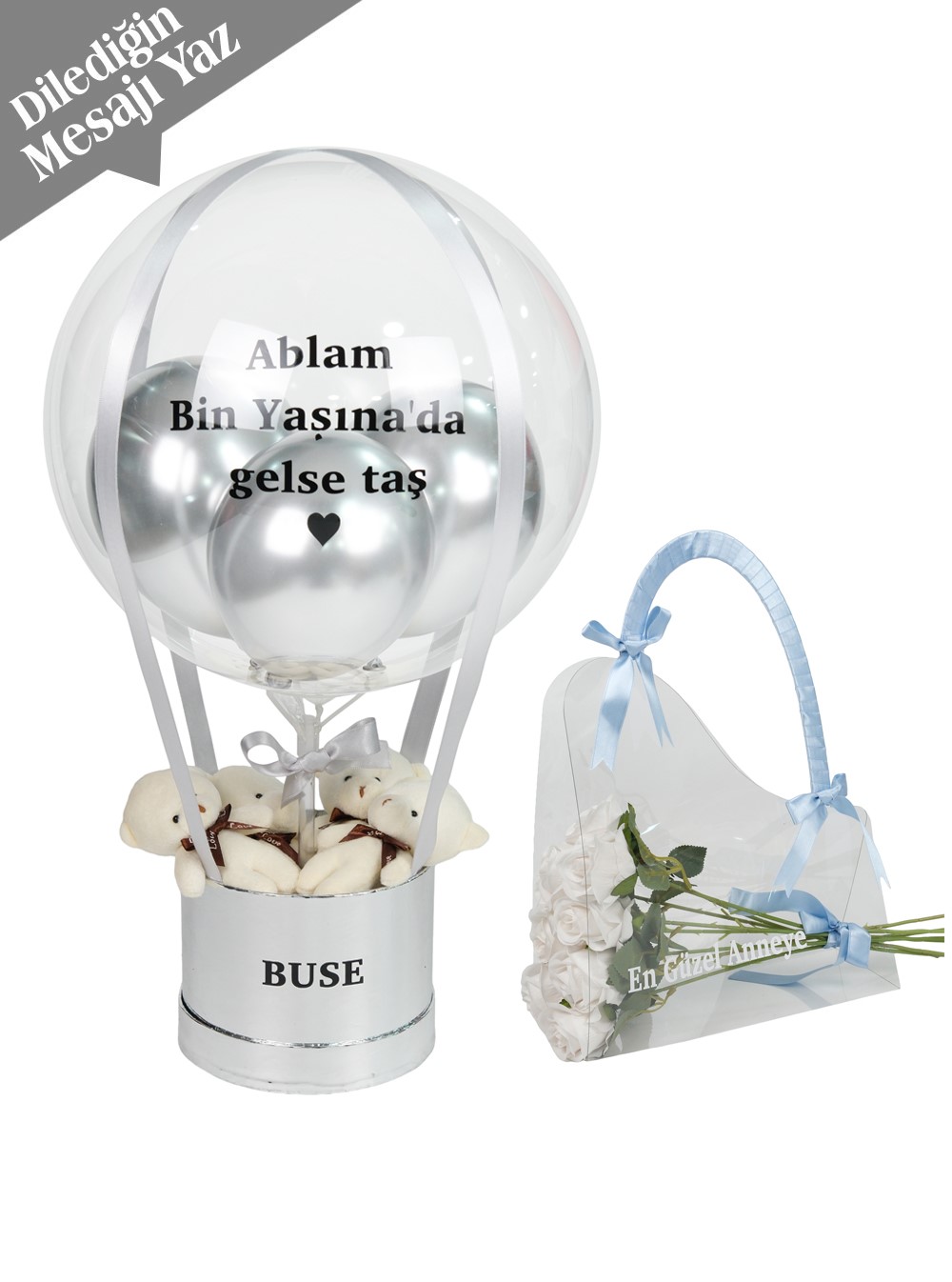 Kişiselleştirme: Balon ve çanta üzerine dilediğiniz mesaj yazılarak hazırlanır, böylece hediyenizin her detayı anlam kazanır.