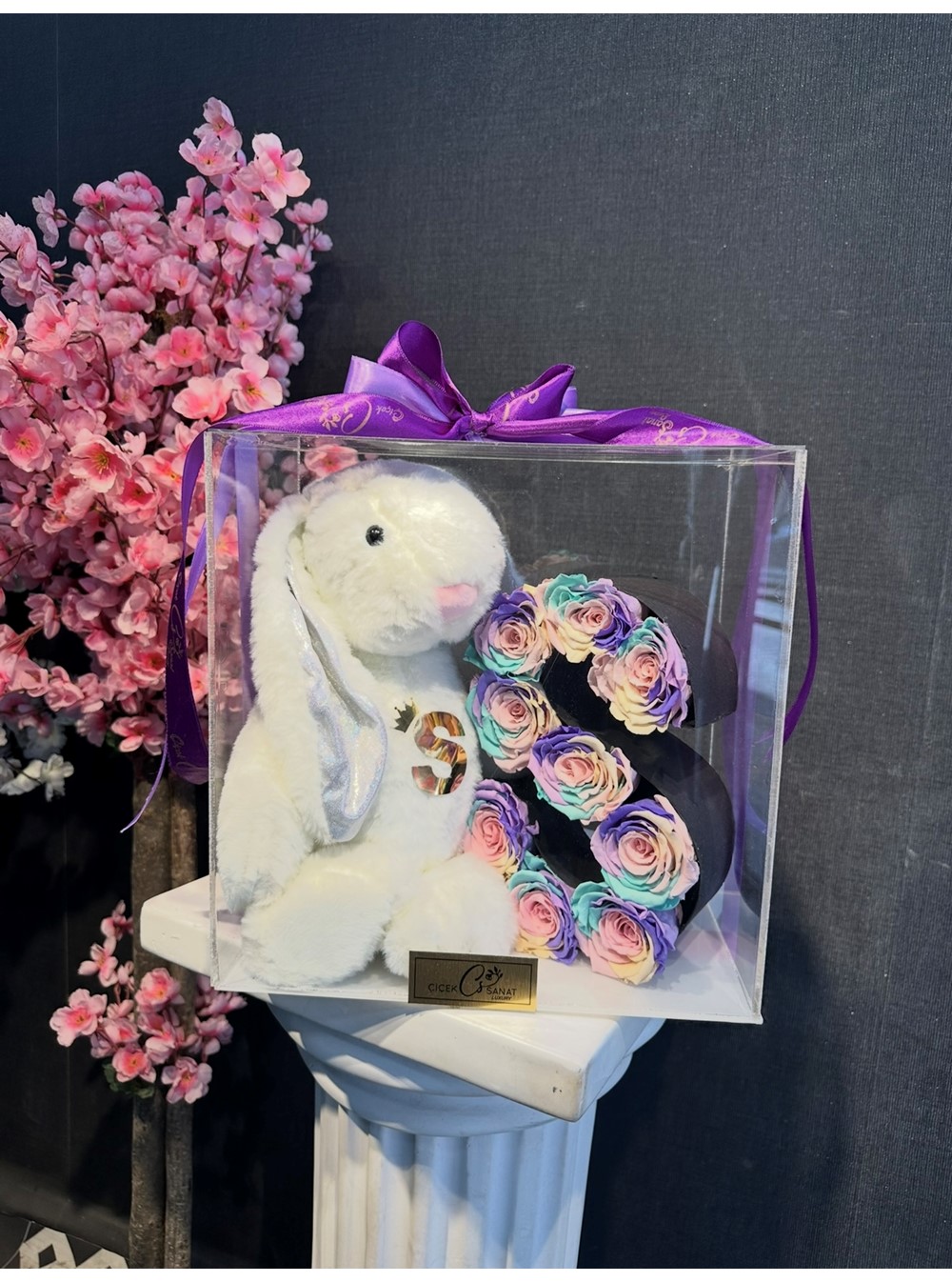 Pleksi kutu içerisinde peluş ayıcık ve solmayan gül ile tasarlanmış kutu harf |