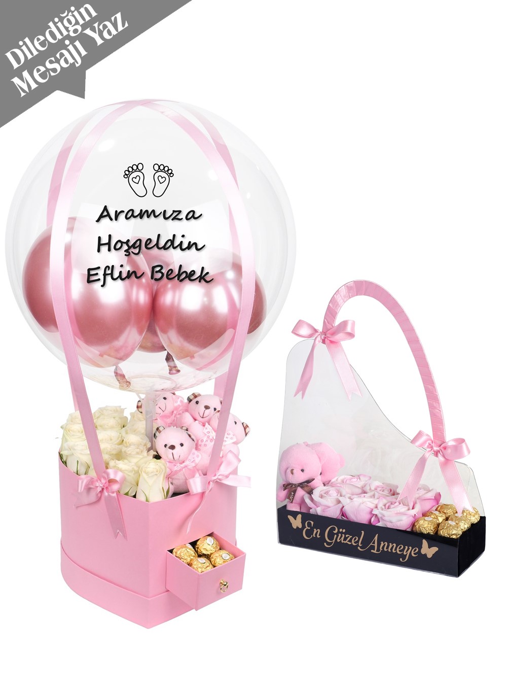 Çanta içerisinde 2 adet ayıcık, 6 adet yapay kalıcı gül, 6 adet rocher çikolata mevcuttur.