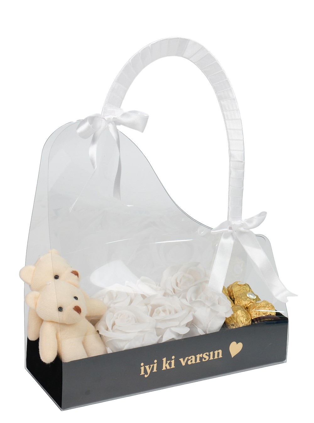 Sevgi dolu anlarınızı kutlamak için harika bir seçenek! Kadife kutuda sunduğumuz bu özel bileşenlerle dolu beyaz çanta, sevgilinize, arkadaşınıza ya da kız arkadaşınıza hediye edebileceğiniz en güzel sürprizlerden biri. Hem şıklığı hem de içeriğiyle dikkat çeken bu hediye seti, özel günlerinizi daha anlamlı kılacak.