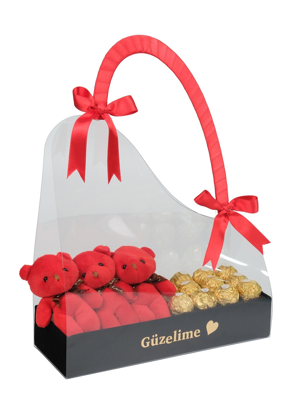 Sevdiklerinizi mutlu etmek için mükemmel bir hediye arıyorsanız, Kadife Kutuda Kişiye Özel Kırmızı Çanta tam size göre! Bu özel hediye seti, zarif bir şeffaf çantada sunuluyor ve içinde birbirinden tatlı 3 kırmızı ayıcık ile lüks 12 adet rocher çikolata yer alıyor.