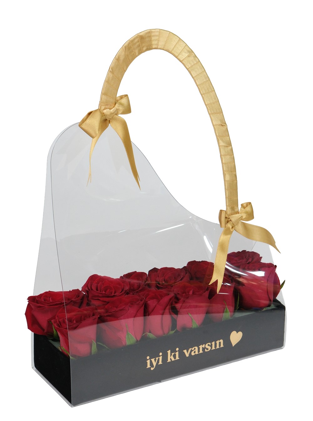 Şeffaf çantada gül sunumu ile birlikte gelen 12 adet kaliteli kırmızı gül, kadife kutuda özenle sunulmaktadır. Bu hediye kutusu, kişisel bir dokunuş katmak için özel olarak tasarlanmış bir yazı ile taçlandırılabilir ve böylece tam anlamıyla kişiye özel bir hediye haline gelir.