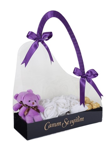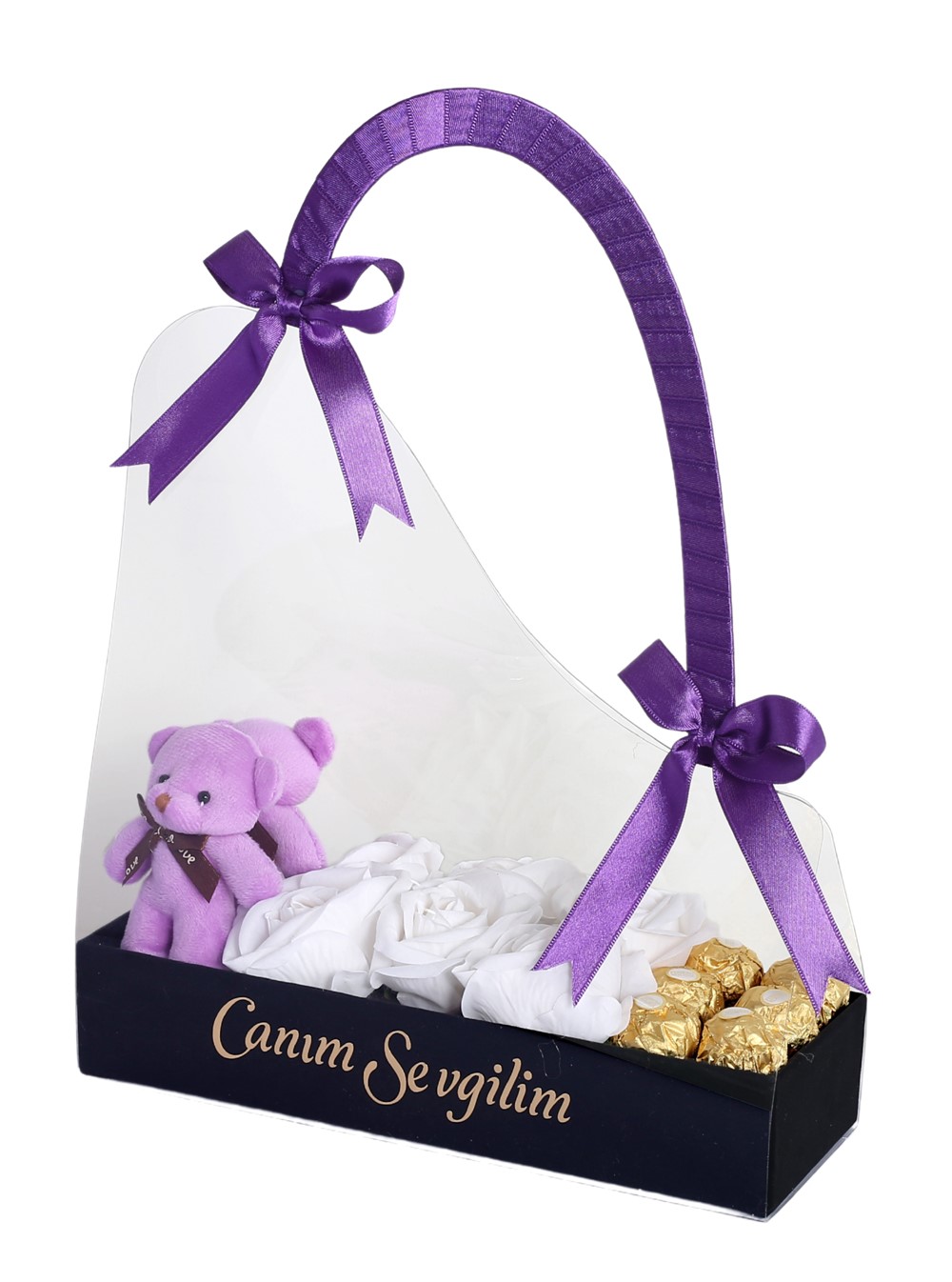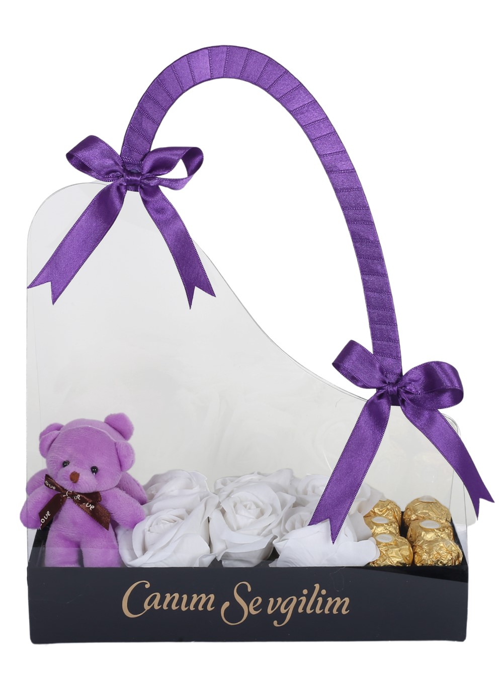 Şeffaf çantada çiçekle birlikte gelen bu özel hediye, 2 adet mini ayıcık, 9 adet kalıcı beyaz gül ve 6 adet Rocher çikolata ile dolup taşar. Sevdiklerinizi düşündüğünüzü gösteren bu tatlı detaylar, onları duygusal olarak saracaktır. Hem görsel hem de lezzetli bir hediye arıyorsanız, doğru yerdesiniz!