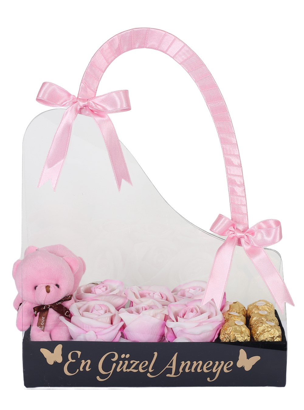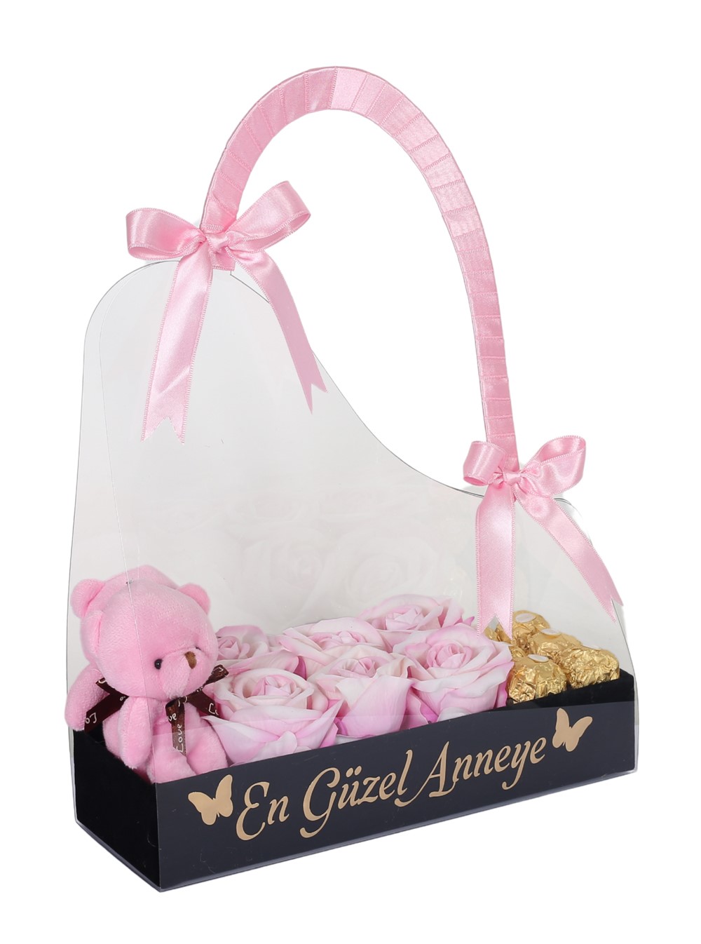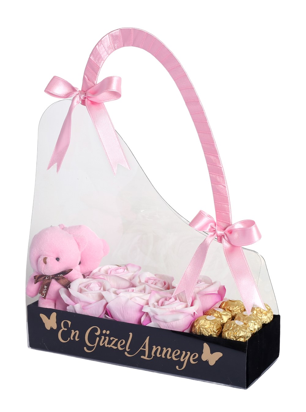 Bu şık kutu, içeriğinde 2 adet pembe peluş ayıcık, 6 adet pembe kalıcı gül ve 6 adet Rocher çikolata barındırıyor. Ayrıca, özel mesajınızı ekleyerek annelerinize olan sevginizi daha özel bir şekilde ifade etme imkanı sunuyor. Anneye çiçek siparişi verirken onun tarzını yansıtan bu özel hediye ile ona ne kadar değer verdiğinizi gösterebilirsiniz.