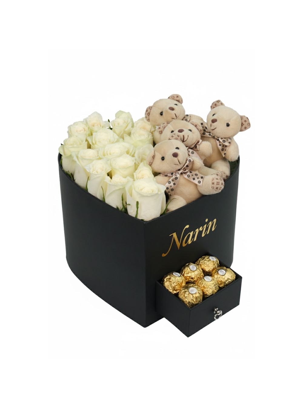 Kalp Çekmeceli Kutuda Beyaz Gül Ayıcık ve Çikolata | Çiçek Sanat