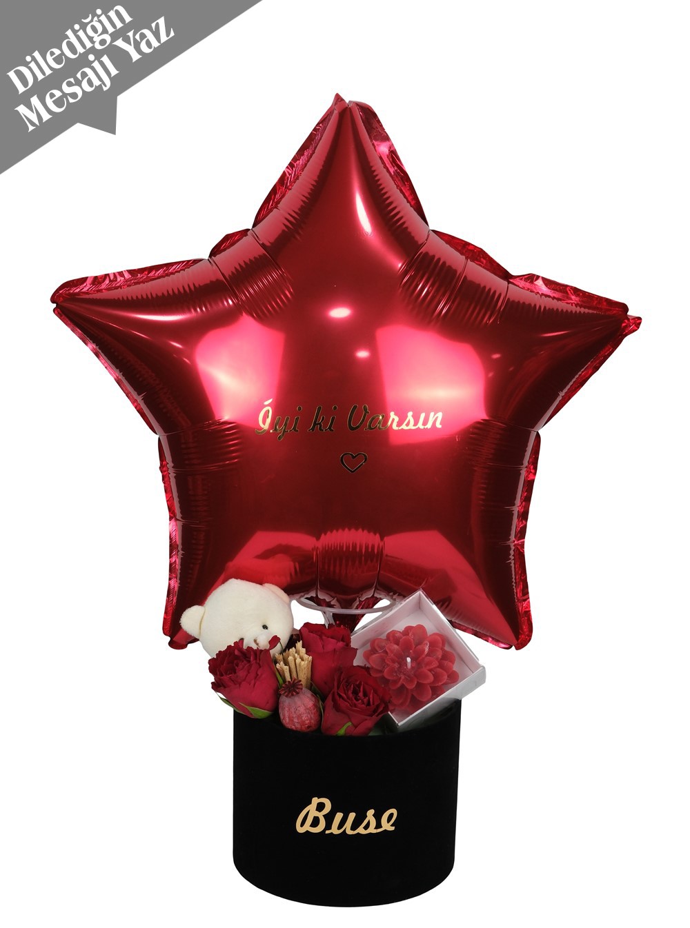 Sevdiklerinize unutulmaz bir hediye vermenin en şık yolunu keşfedin! Kişiye Özel Kırmızı Yıldız Balon Kutusu, zarif çiçeklerle süslenmiş özel bir kutuda, mutluluğunuzu sevdiklerinizle paylaşmanız için tasarlandı. Doğum günü hediyesi, yıl dönümü, sevgililer Günü ve anneler günü gibi özel günlerde sevdiklerinizi mutlu etmek için mükemmel bir seçenek sunuyor.