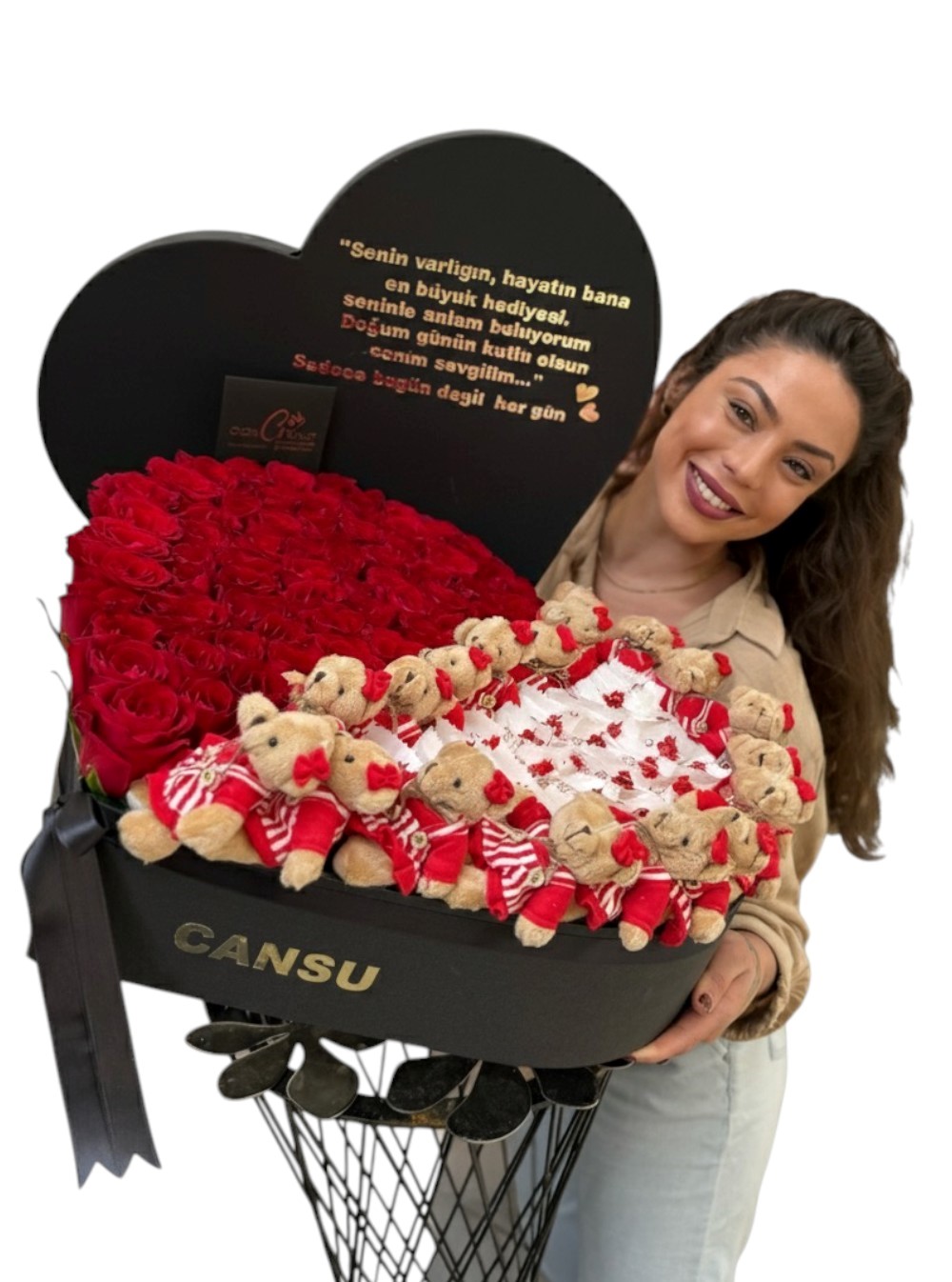 Kutunun kapağında yer alan yazacağınız kişiye özel mesajınız ile bu dolu dolu hediyeye daha da anlamlı hale geliyor. Yıl dönümü, sevgililer günü veya içinizden gelen herhangi bir günde, sevginizi en cömert şekilde göstermek için mükemmel bir seçim.