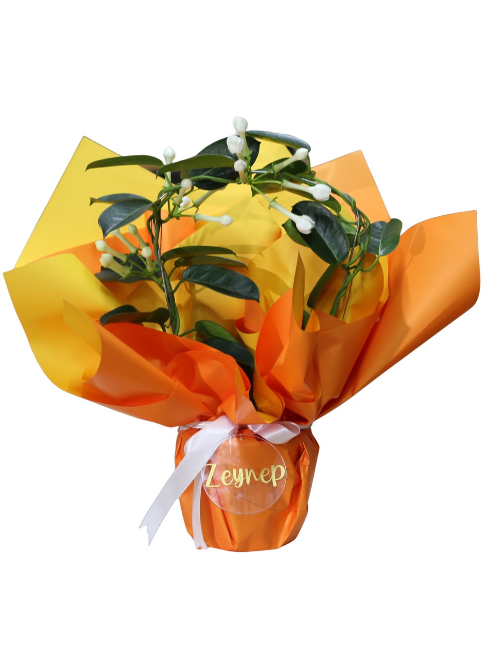 Tatlı ve baş döndürücü kokusuyla hafızalarda iz bırakan Yasemin çiçeği ile sevdiklerinize unutulmaz bir sürpriz yapın. Zarif beyaz çiçekleri ve parlak yeşil yapraklarıyla bulunduğu her ortama huzur ve ferahlık katan bu özel bitki, canlı sarı ve turuncu tonlardaki şık paketiyle sunuluyor.