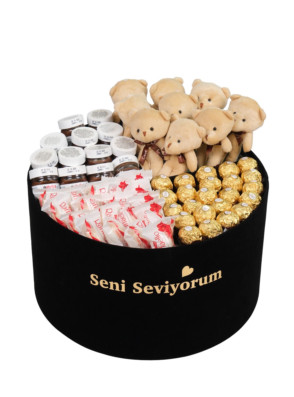Sevdiğiniz kişiye unutulmaz bir hediye vermek için harika bir fırsat! Kişiye özel kutuda çikolatalar ile dolu olan bu şık siyah yuvarlak kutu, özel isimler yazılarak kişiselleştirilebilmektedir. İçerisinde lezzetli rocher çikolatalar, nefis raffaello çikolatalar, tatlı nutella kavanozları ve sevimli peluş ayıcıklar barındıran bu kutu, sevgiliye hediye olarak mükemmel bir seçimdir.