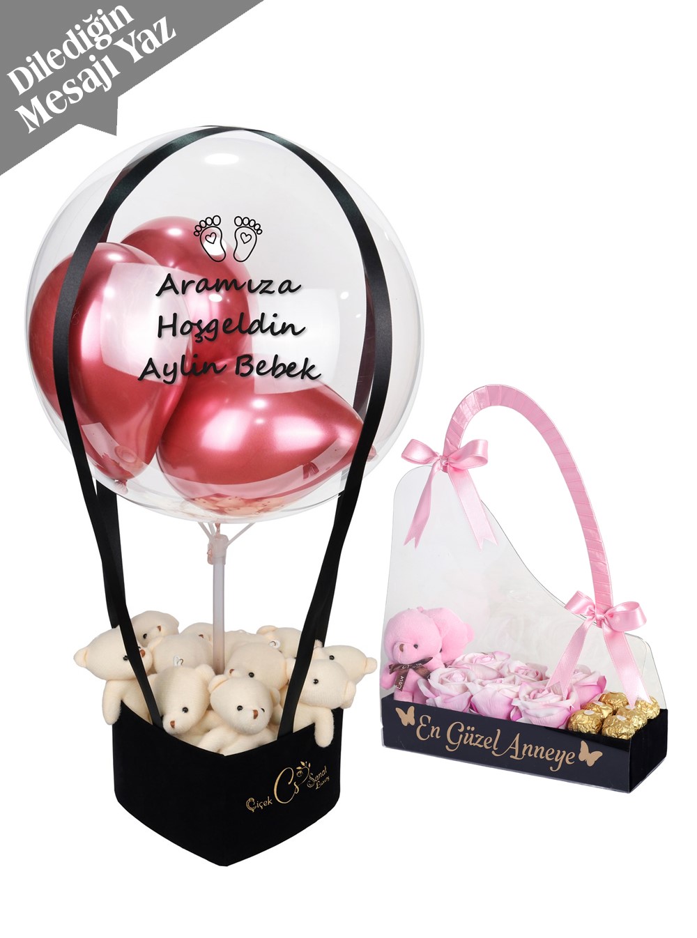 Çanta içerisinde 2 adet ayıcık, 6 adet yapay kalıcı gül, 6 adet rocher çikolata mevcuttur.