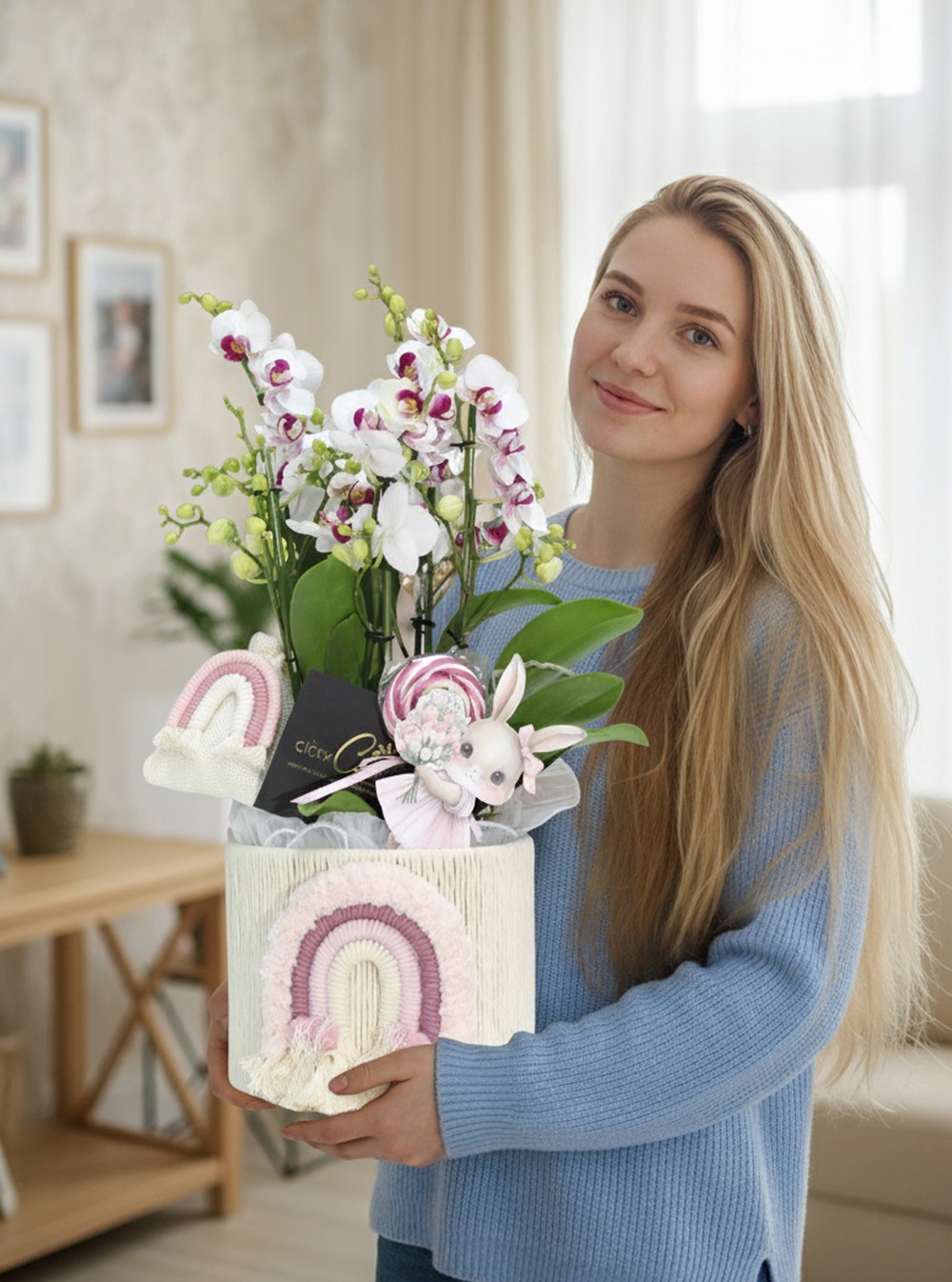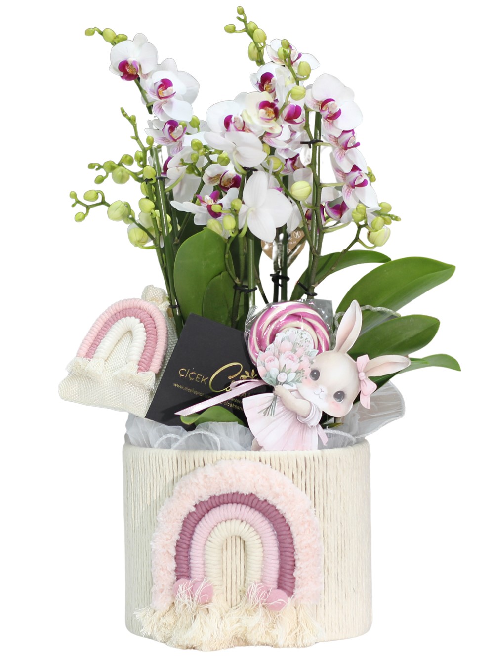 Bohem şıklık, narin zarafetle buluştu! Beyaz ve mor tonlardaki göz alıcı orkide çiçekleri, el yapımı makrome saksı ve üzerinde pudra tonlarında gökkuşağı detayı ile sunuluyor. Sevimli tavşan kartı ve lolipop ile zenginleştirilmiş bu aranjman, özellikle bebek odası ve doğum kutlamaları için ideal. Modern, sıcak ve unutulmaz bir hediye alternatifi