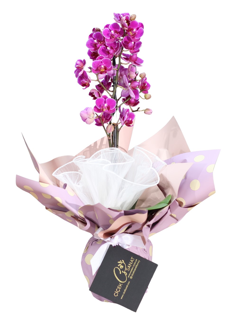 -Zarif Sunum: Pembe ve mor tonlardaki altın puantiye detaylı özel ambalaj kağıdı, mor orkidenin asil güzelliğini şık bir şekilde çerçeveler. Merkezdeki beyaz tül detayı ise aranjmana narin ve sofistike bir dokunuş katar.