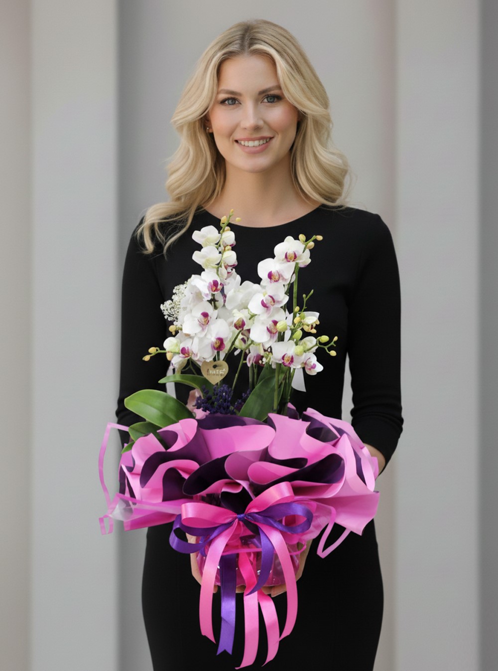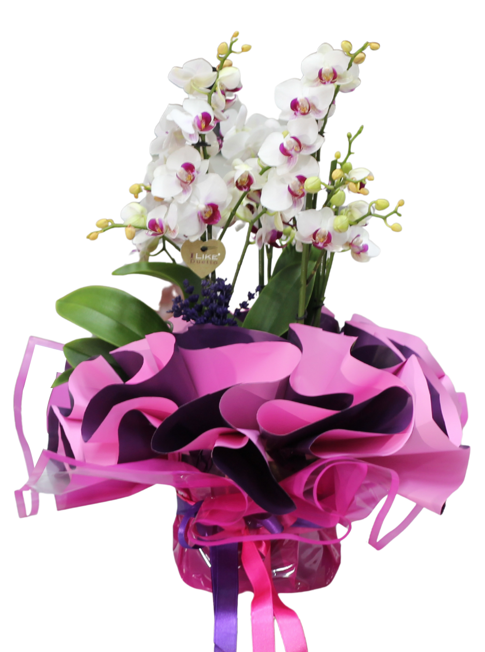 Asaletin ve saf sevginin simgesi olan beyaz phalaenopsis orkide, bu özel tasarımda enerjik renklerle buluşuyor. Göz alıcı pembe ve koyu mor tonlardaki modern ambalajı, orkidenin duru güzelliğini mükemmel bir şekilde vurgularken, gizemli bir şekilde sarılmış alt kısmı tasarıma modern bir şıklık katıyor.