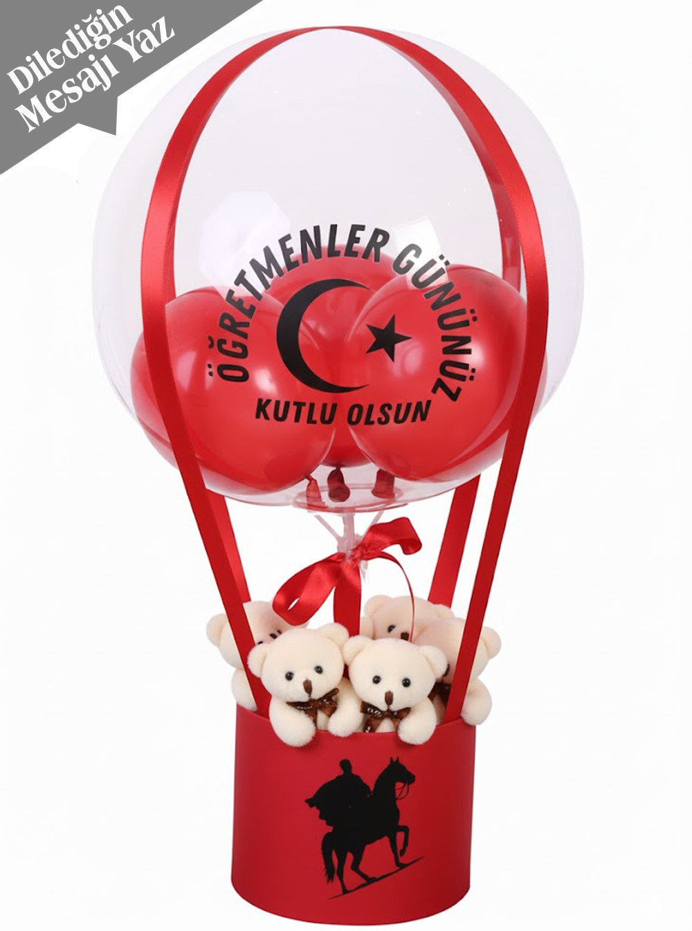 bulunmaktadır. Kırmızı kurdelelerle tamamlanan bu uçan balon tasarımı, öğretmenlerinize olan minnettarlığınızı en gösterişli ve kalıcı şekilde ifade etmenizi sağlar.