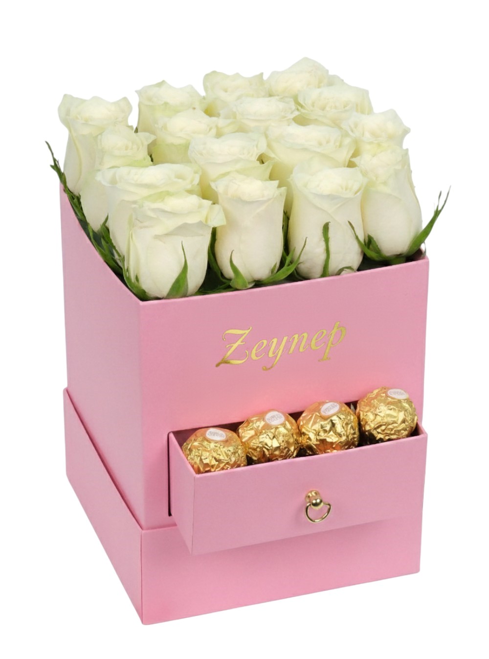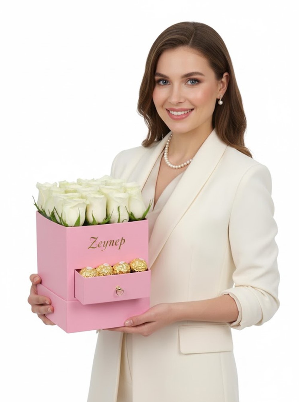 Pembe Kare Kutuda Beyaz Güller ve Çikolata