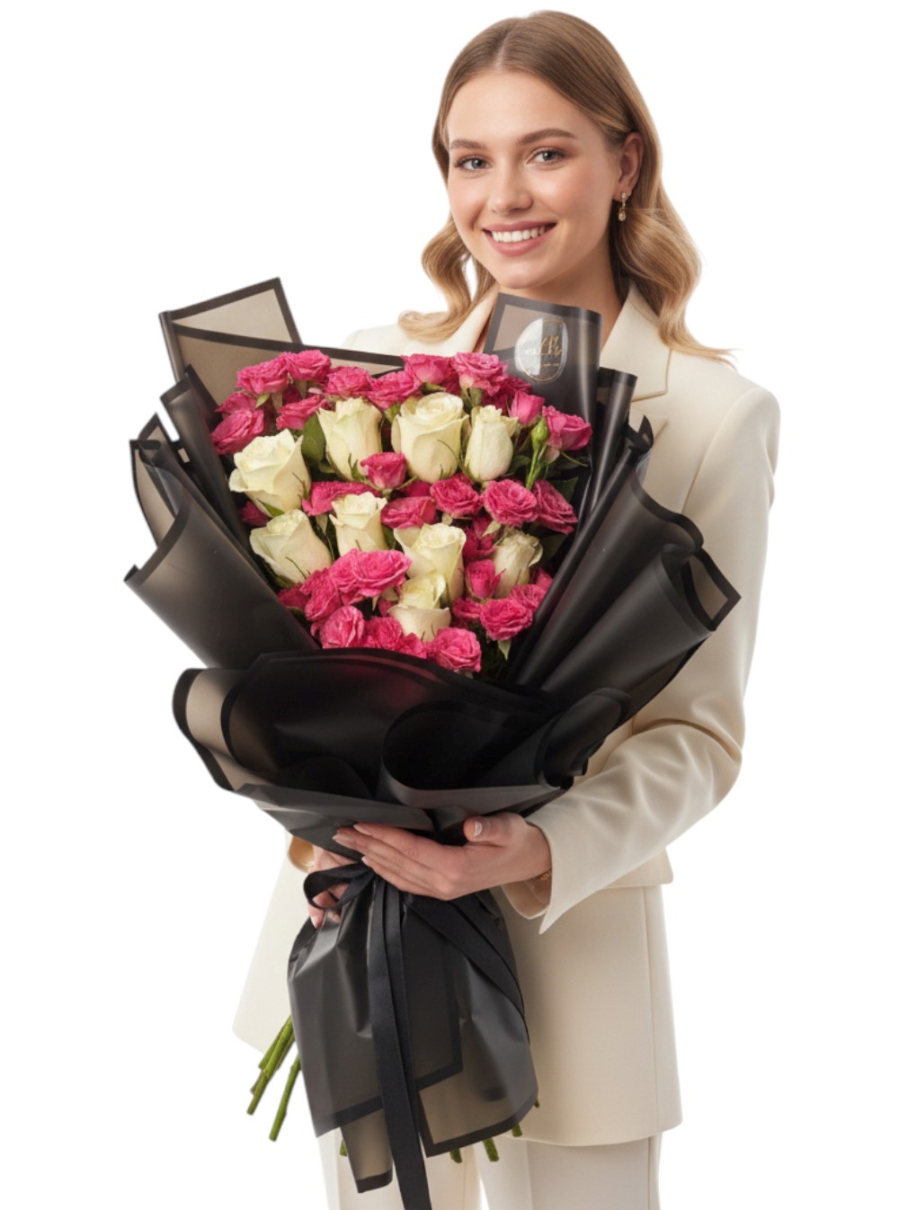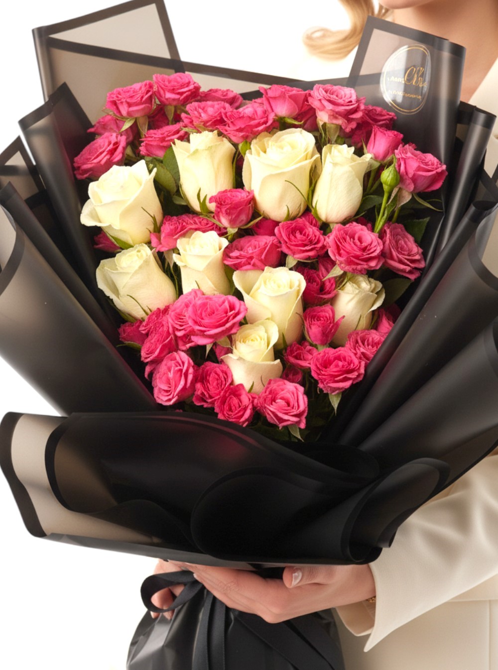 Zıtlıkların mükemmel uyumunu sergileyen bu özel buket, en saf duygularınızı ifade etmenin en zarif yoludur. Asil siyah ambalaj içerisinde sunulan, taptaze pembe ve beyaz güllerin büyüleyici birlikteliği, sevginin ve masumiyetin simgesidir.