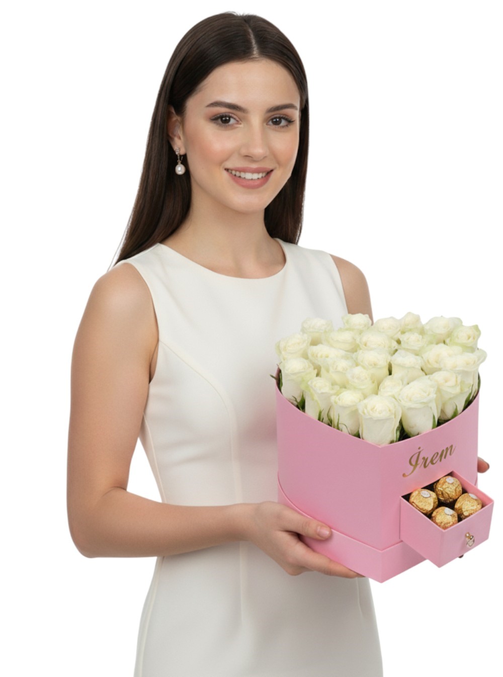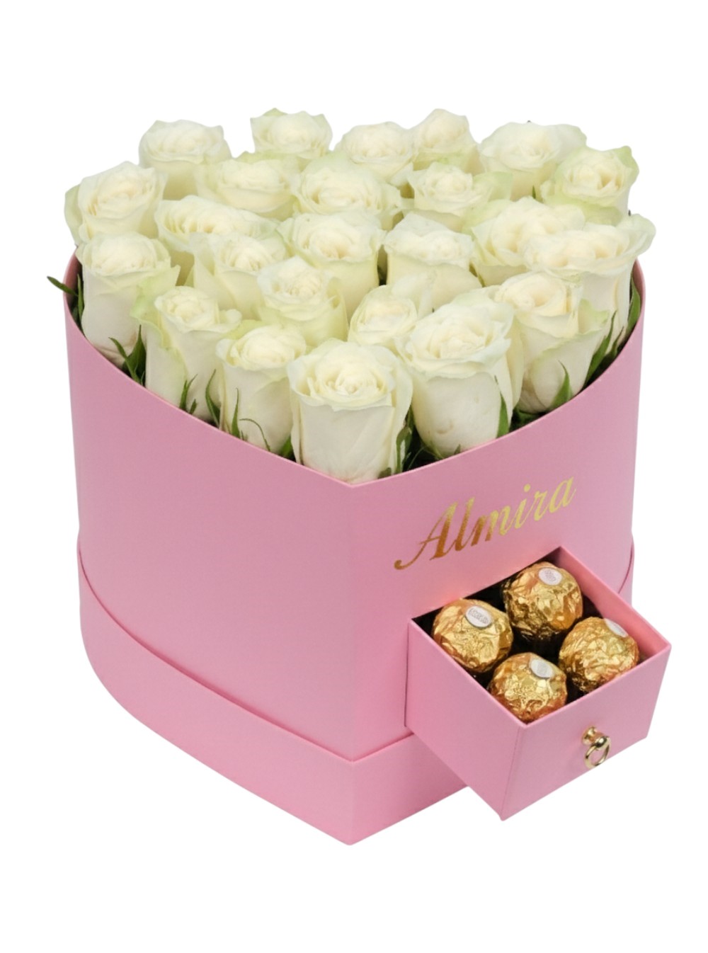 Pembe Kalp Çekmeceli Kutuda Beyaz Güller ve Çikolata | Çiçek Sanat
