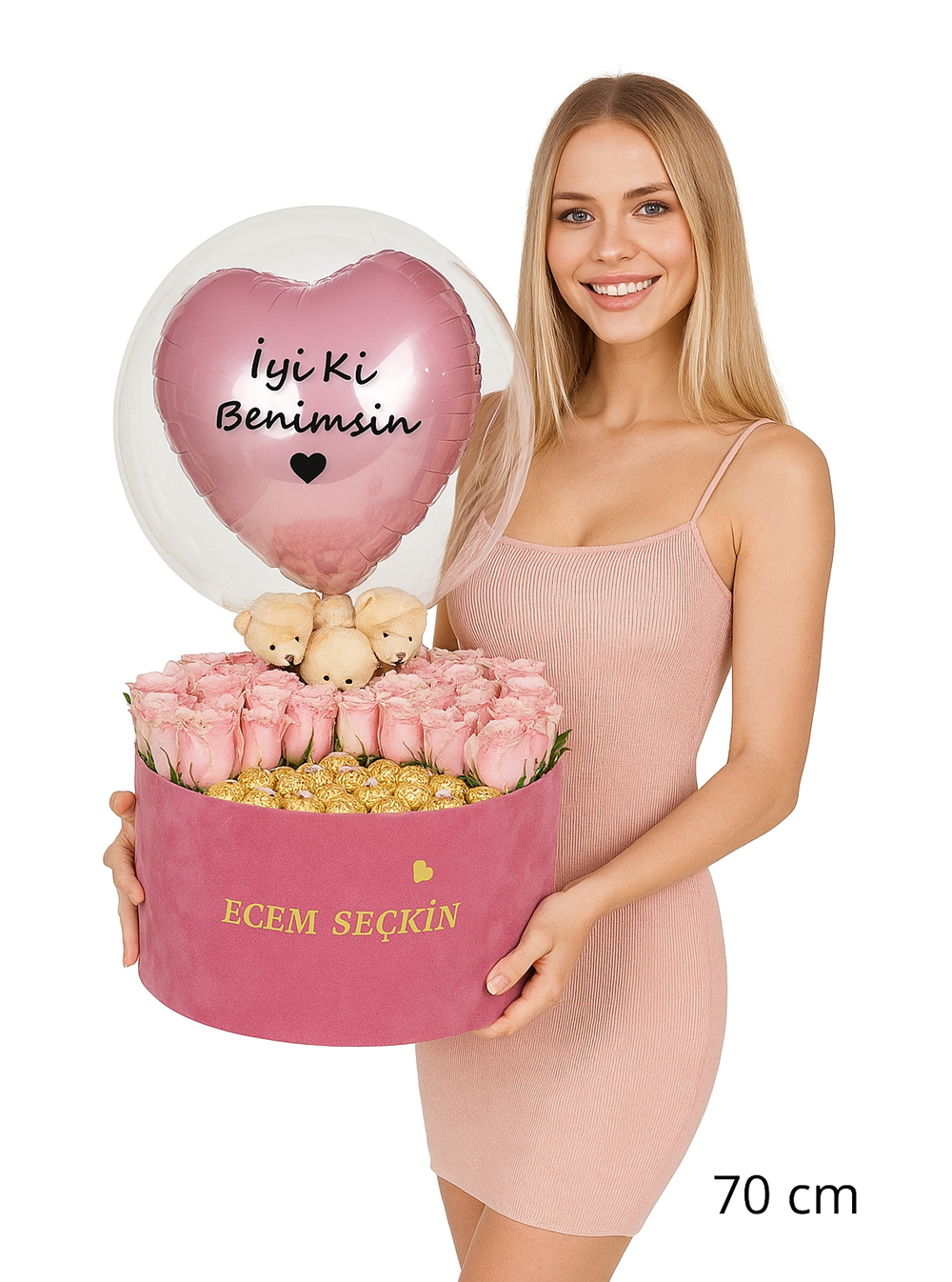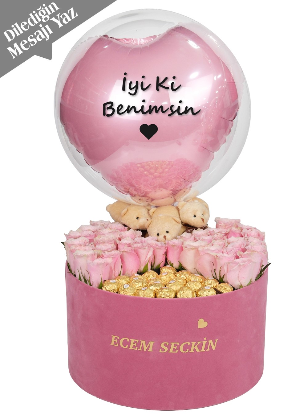 Sevdiklerinize duygularınızı en özel şekilde ifade etmenin zamanı! Kişiye özel pembe kutuda pembe güller, lezzetli rocher çikolatalar ve sevimli bir peluş ayıcık ile hazırlanan bu özel hediye, sevgilinize unutulmaz anlar yaşatacak. Hem zarif görünümü hem de kişisel dokunuşu sayesinde, bu hediye gerçekten benzersiz bir seçenek sunuyor.