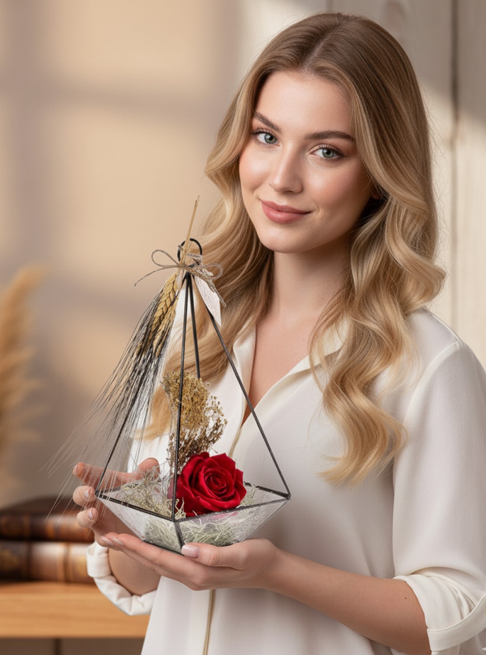 Prizma Üçgen Camda Solmayan Gül Kırmızı | Çiçek Sanat