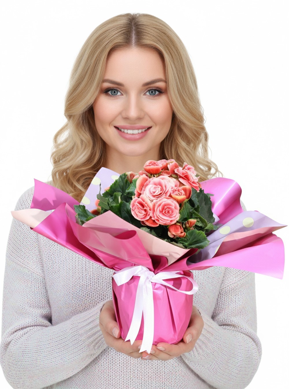 Zarafetin ve içtenliğin rengi pembe, gülü andıran katmerli çiçeklerle buluştu. Bu özel Pembe Gül Begonya aranjmanı, en tatlı duygularınızı ifade etmeniz için tasarlandı. Canlı pembe ve sevimli puantiyelerle süslenmiş modern paketi, çiçeğin naif güzelliğini mükemmel bir şekilde tamamlıyor.
