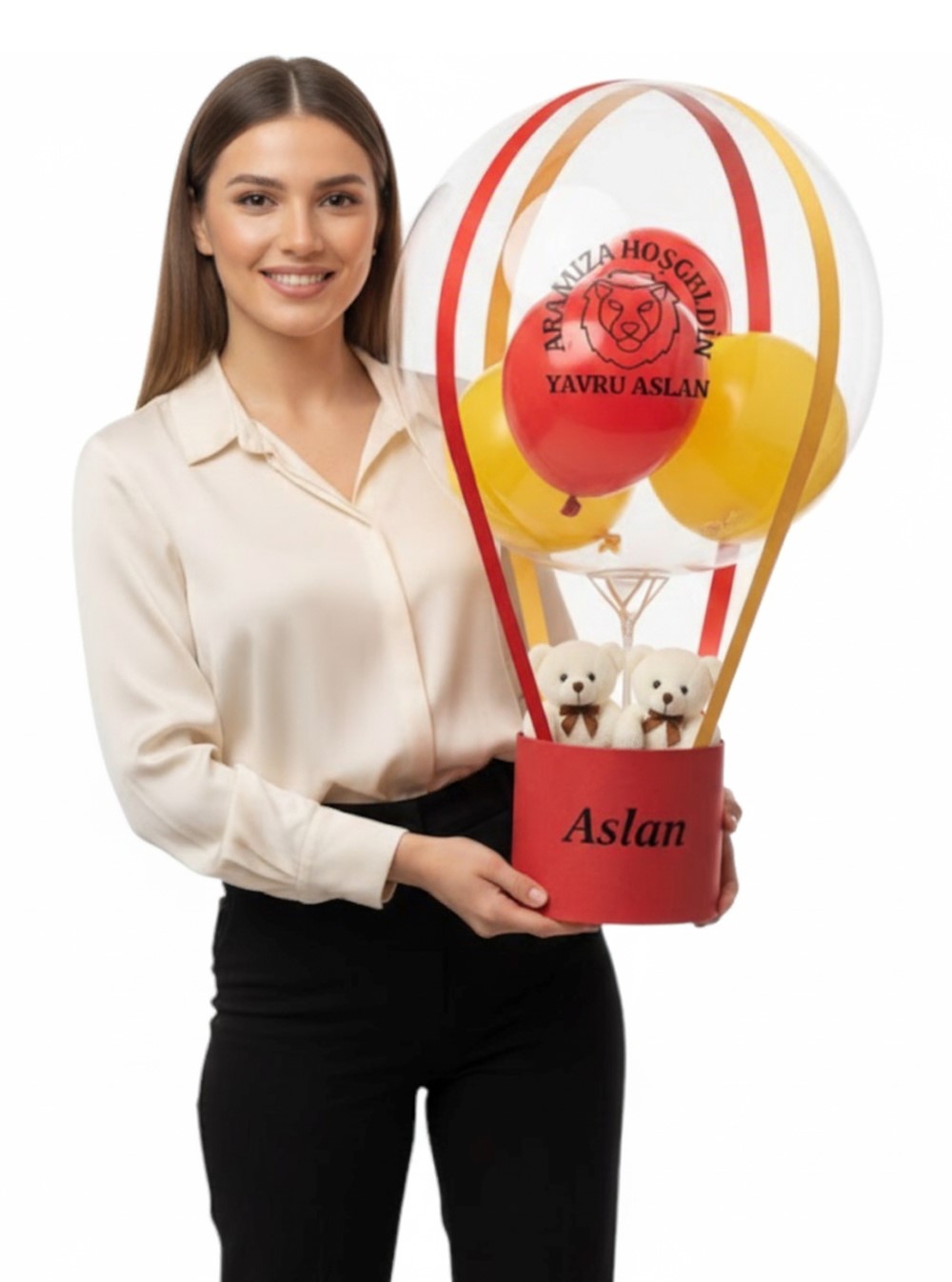 Tasarım: İçerisinde sevimli ayıcıklar ve konsepte uygun renkte balonların yer aldığı bu özel tasarım, "Aramıza Hoş Geldin Yavru Aslan" mesajı ve bebeğin ismi ile kişiselleştirilir. Şık kurdele detayları ile tamamlanan bu aranjman, odanın en güzel köşesinde yerini alacaktır.