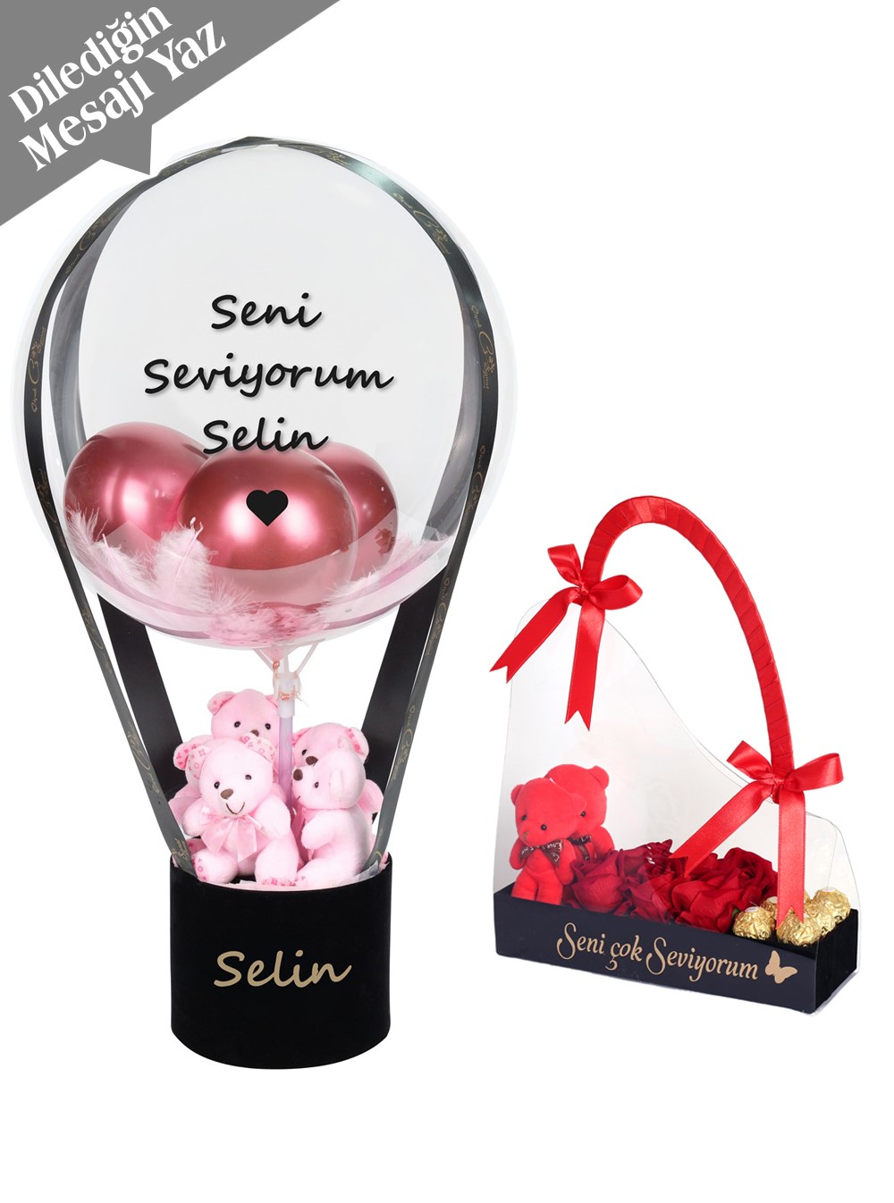 Çanta içerisinde 2 adet ayıcık, 6 adet yapay kalıcı gül, 6 adet rocher marka çikolata mevcuttur.