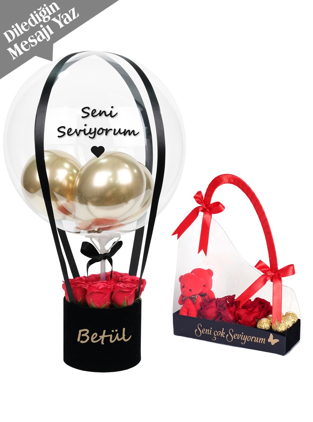 Çanta içerisinde 2 adet ayıcık, 6 adet yapay kalıcı gül, 6 adet rocher çikolata mevcuttur.