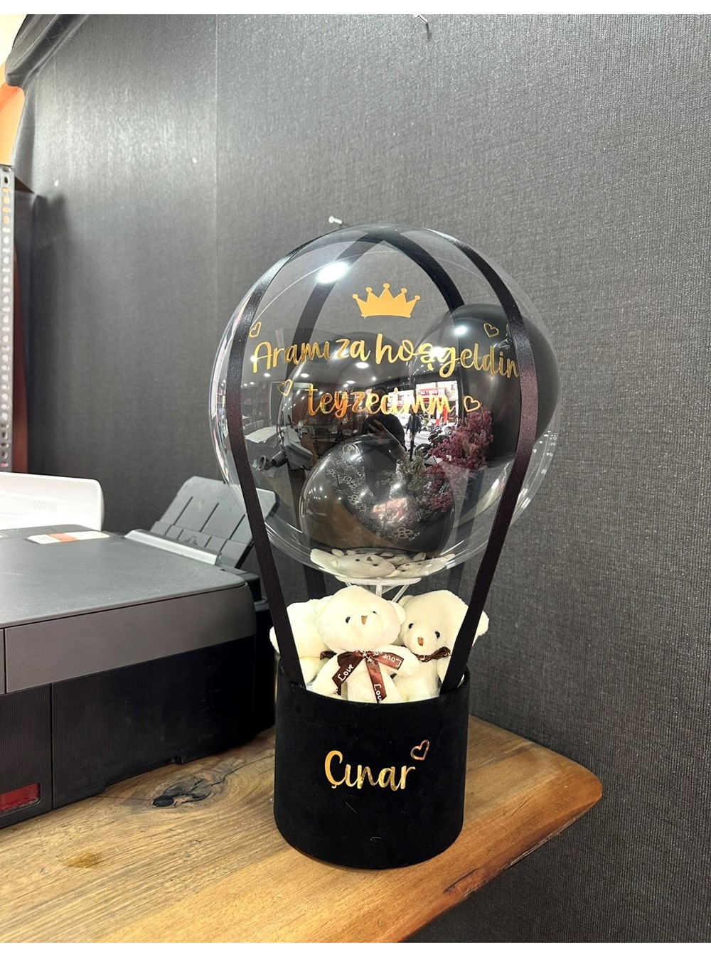 Siyah Gold Balon Kutusu, 55 cm uzunluğundaki kadife kutusunda sunuluyor. Hem göz alıcı hem de anlam dolu bir hediye alternatifi olarak, yeni bir yaşama merhaba diyen bebekler için harika bir seçenek! Bu hediyeyi tercih ederek, onlara olan sevginizi en güzel şekilde gösterebilirsiniz.