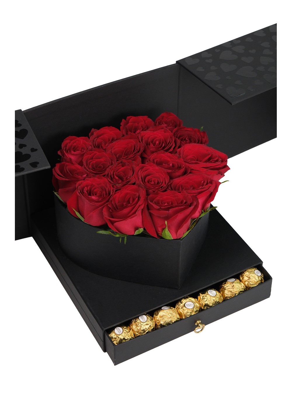 Siyah Kalp Kutuda Premium Kırmızı Güller ve Çikolata