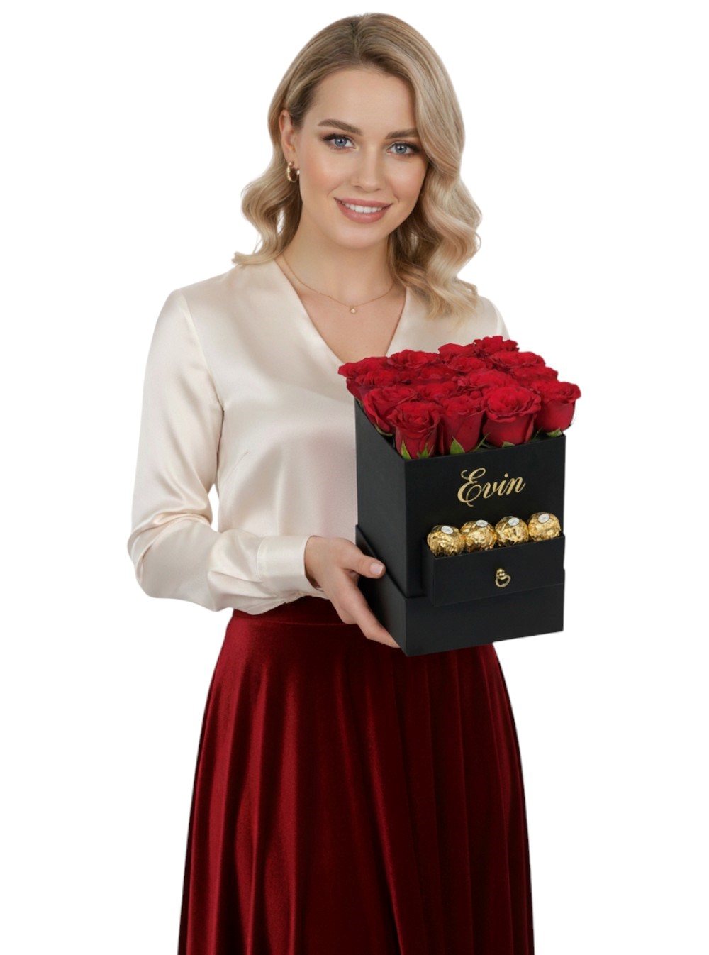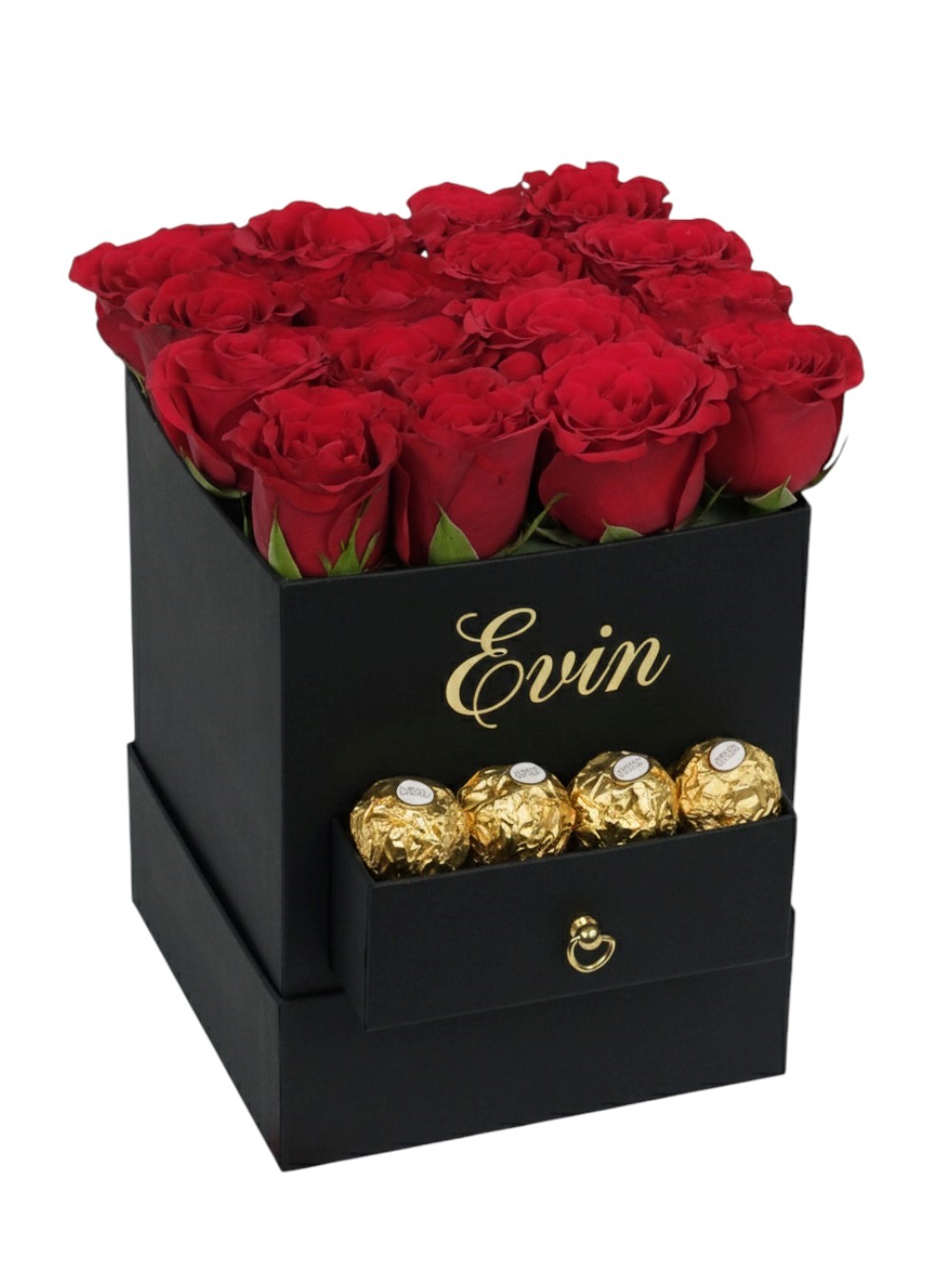 Siyah Kare Kutuda Kırmızı Güller ve Çikolata | Çiçek Sanat
