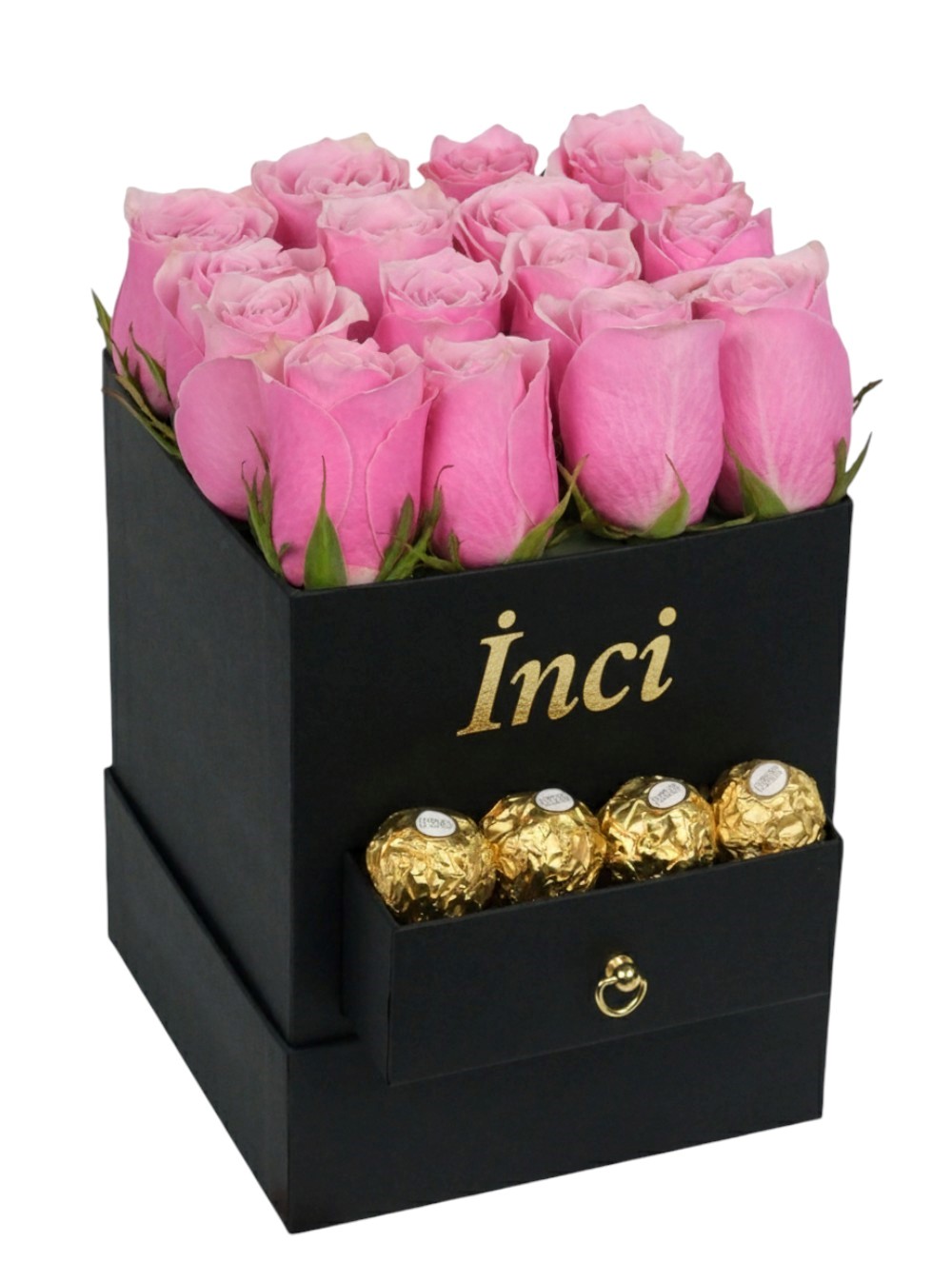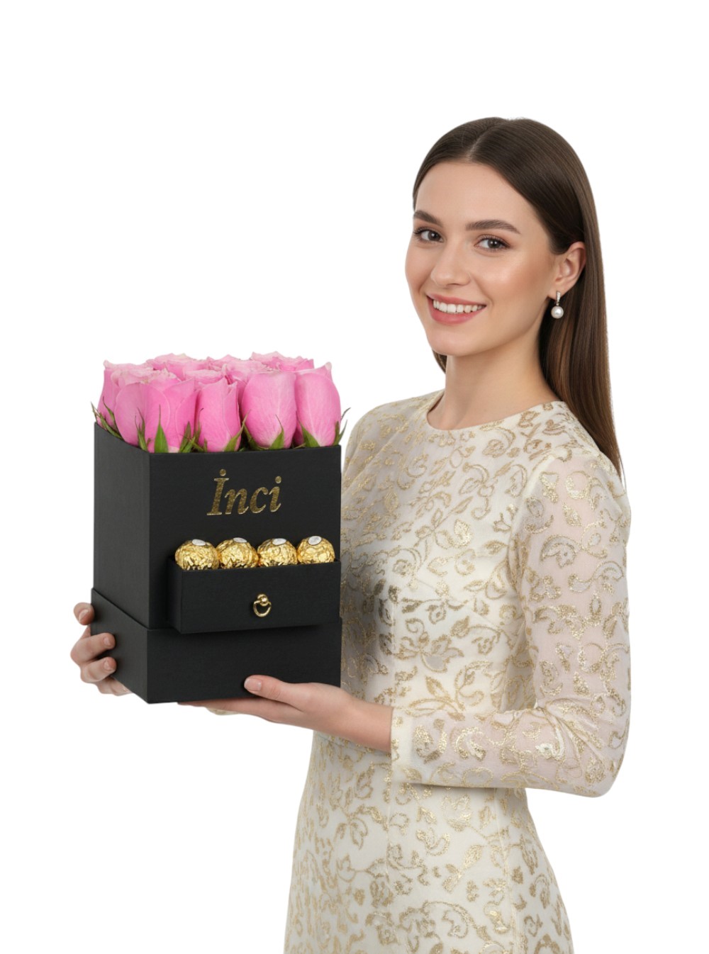 Siyah Kare Kutuda Pembe Güller ve Çikolata