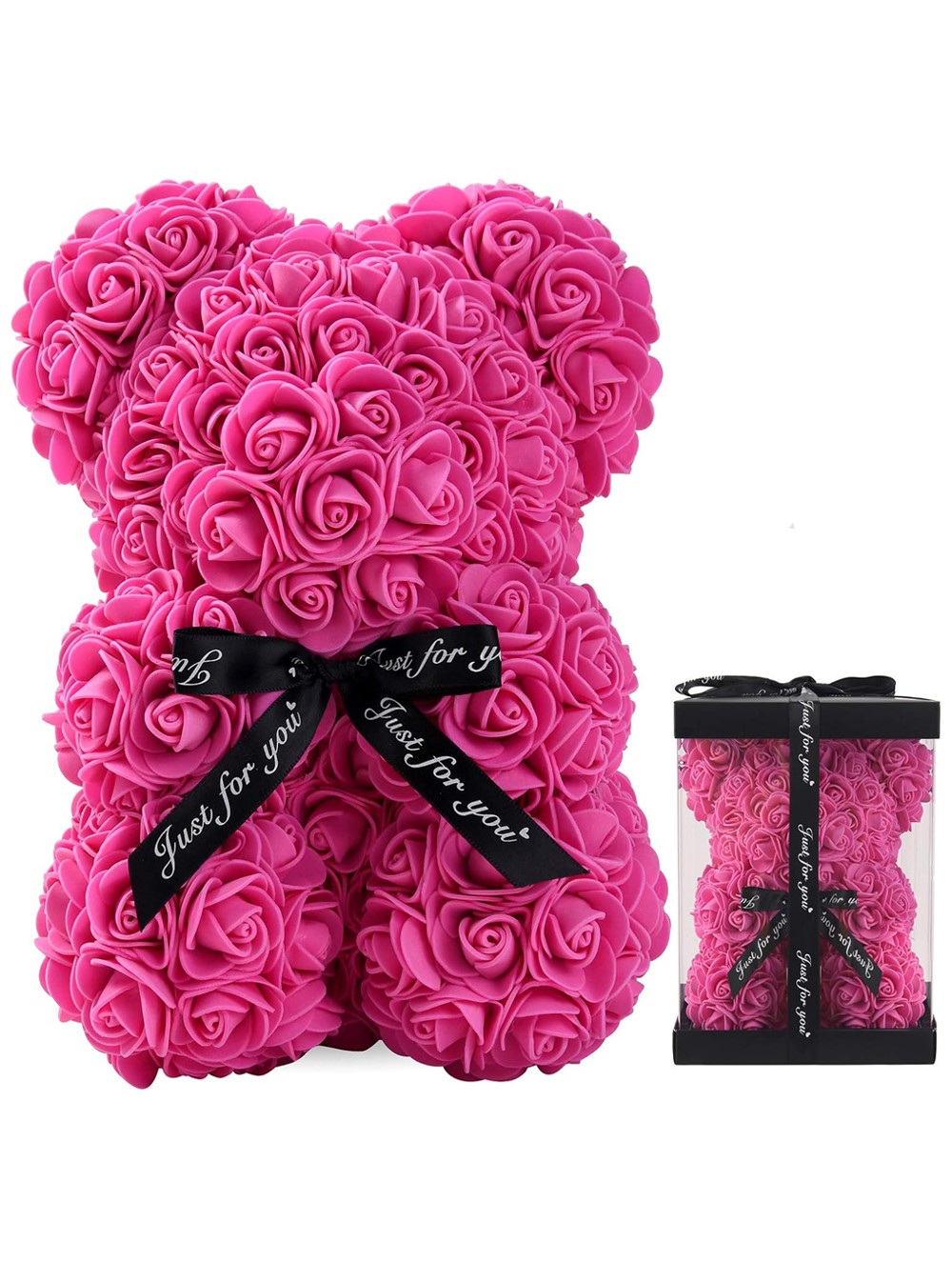 Canlı Pembe rengiyle pozitif enerji yayan güller, sevginizin ve mutluluğunuzun hiç solmayacak bir sembolü olacak. Üzerinde "Just for you" yazan zarif siyah kurdelesi ve şık şeffaf hediye kutusu ile bu özel ayıcık, sevdiklerinizi ilk gördükleri andan itibaren büyüleyecek.