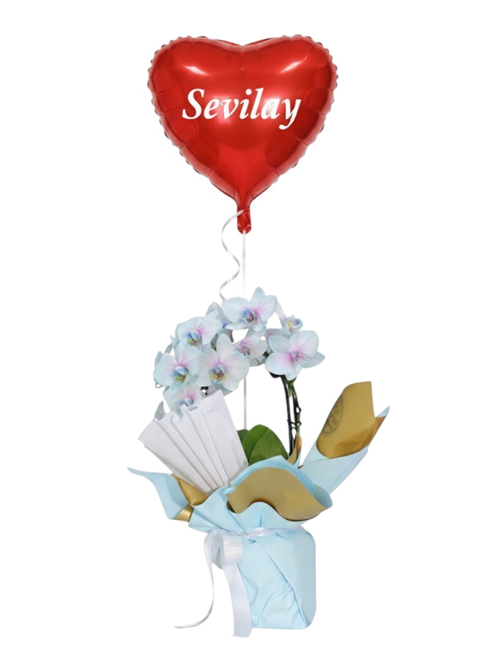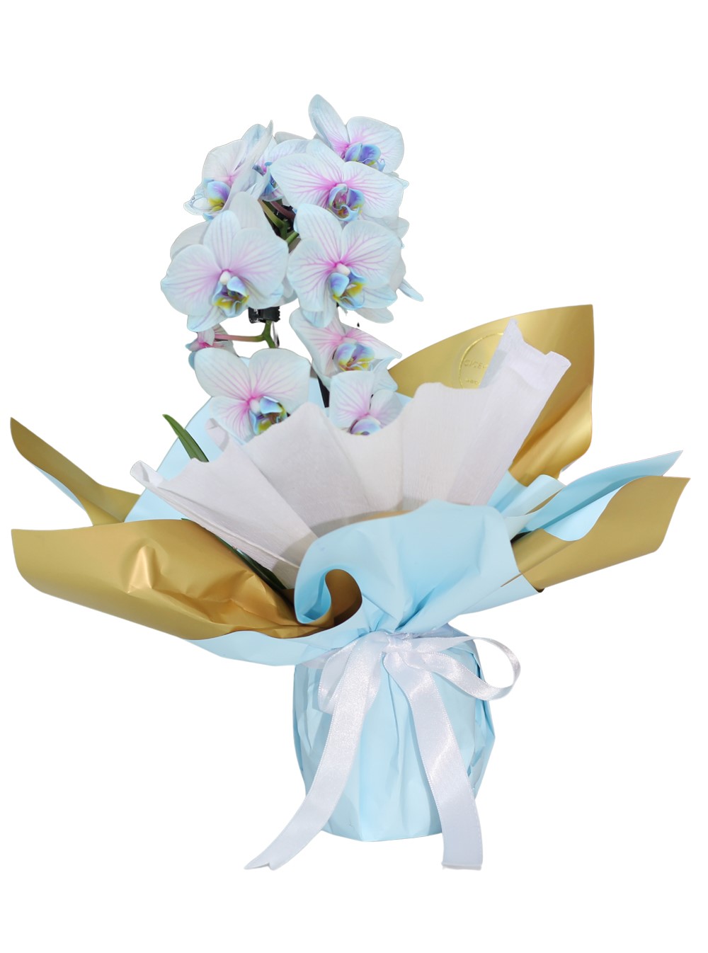 Sıra dışı ve büyüleyici bir güzellik... Bu özel phalaenopsis orkide, beyaz yapraklar üzerine pastel mavi/turkuaz ve pembe çizgileriyle adeta rüya gibi bir görünüm sunar. Çift dallı yapısıyla gösterişli bir duruş sergileyen bu nadir çiçek, modern tasarımıyla da göz alıcıdır.