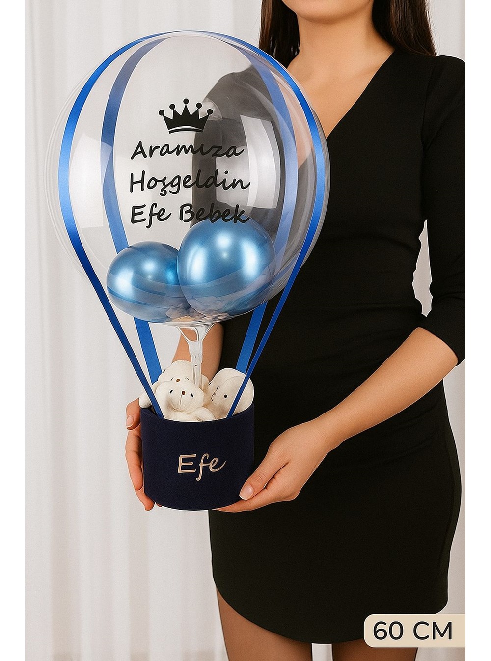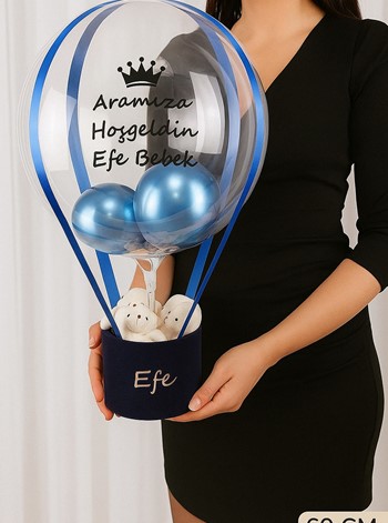 Tasarım: İçerisinde sevimli ayıcıklar ve konsepte uygun renkte balonların yer aldığı bu özel tasarım, "Aramıza Hoş Geldin" mesajı ve bebeğin ismi ile kişiselleştirilir. Şık kurdele detayları ile tamamlanan bu aranjman, odanın en güzel köşesinde yerini alacaktır.