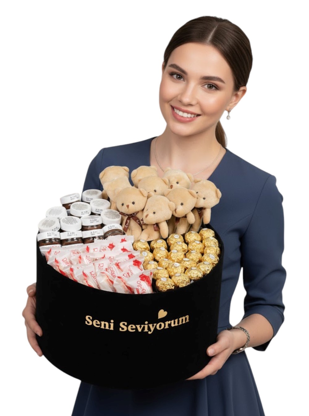 Sevdiğiniz kişiye unutulmaz bir hediye vermek için harika bir fırsat! Kişiye özel kutuda çikolatalar ile dolu olan bu şık siyah yuvarlak kutu, özel isimler yazılarak kişiselleştirilebilmektedir. İçerisinde lezzetli rocher çikolatalar, nefis raffaello çikolatalar, tatlı nutella kavanozları ve sevimli peluş ayıcıklar barındıran bu kutu, sevgiliye hediye olarak mükemmel bir seçimdir.