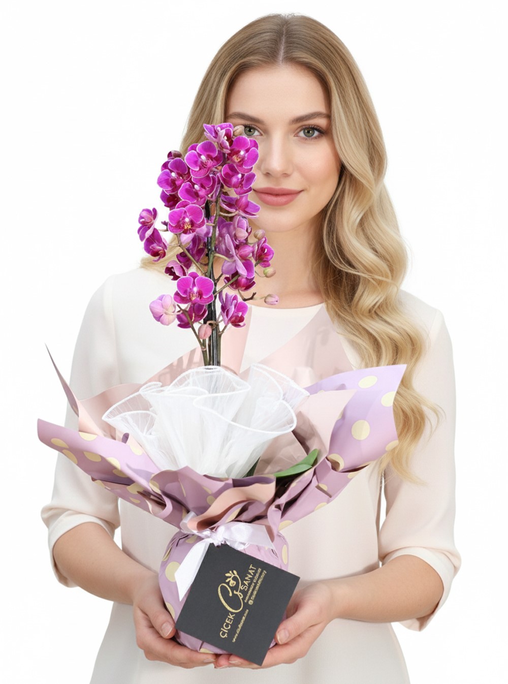 -Zarif Sunum: Pembe ve mor tonlardaki altın puantiye detaylı özel ambalaj kağıdı, mor orkidenin asil güzelliğini şık bir şekilde çerçeveler. Merkezdeki beyaz tül detayı ise aranjmana narin ve sofistike bir dokunuş katar.