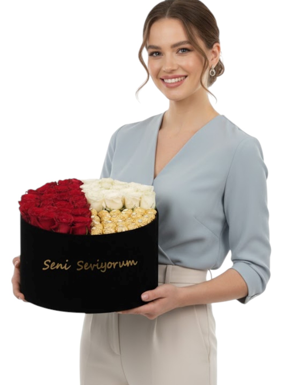 Sevginizi en şık şekilde ifade edin! Yuvarlak Kutuda Güller ve Çikolatalar, hem göz alıcı hem de lezzetli bir hediye alternatifi arayanlar için ideal. Bu özel tasarımda premium kırmızı ve beyaz güller, yanı sıra lezzetli rocher çikolatalar yer alıyor. Sevgilinize ya da değer verdiğiniz birine, doğum gününde veya sevgililer gününde unutulmaz bir sürpriz yapmak için mükemmel bir seçim!